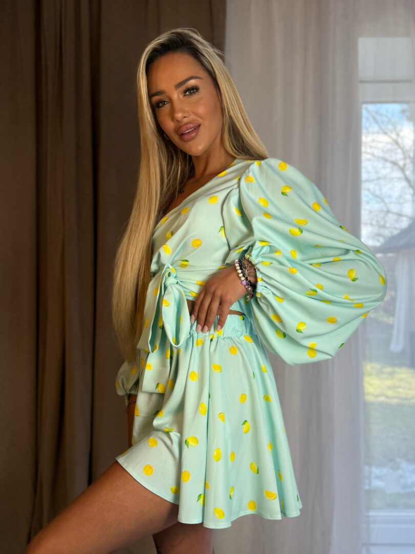 Delikatny, kwiatowy print nadaje całości świeżości i kobiecego uroku, dzięki czemu komplet doskonale sprawdzi się na wyjścia, wakacje, randki oraz letnie eventy.