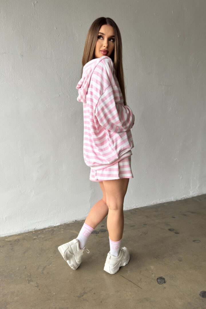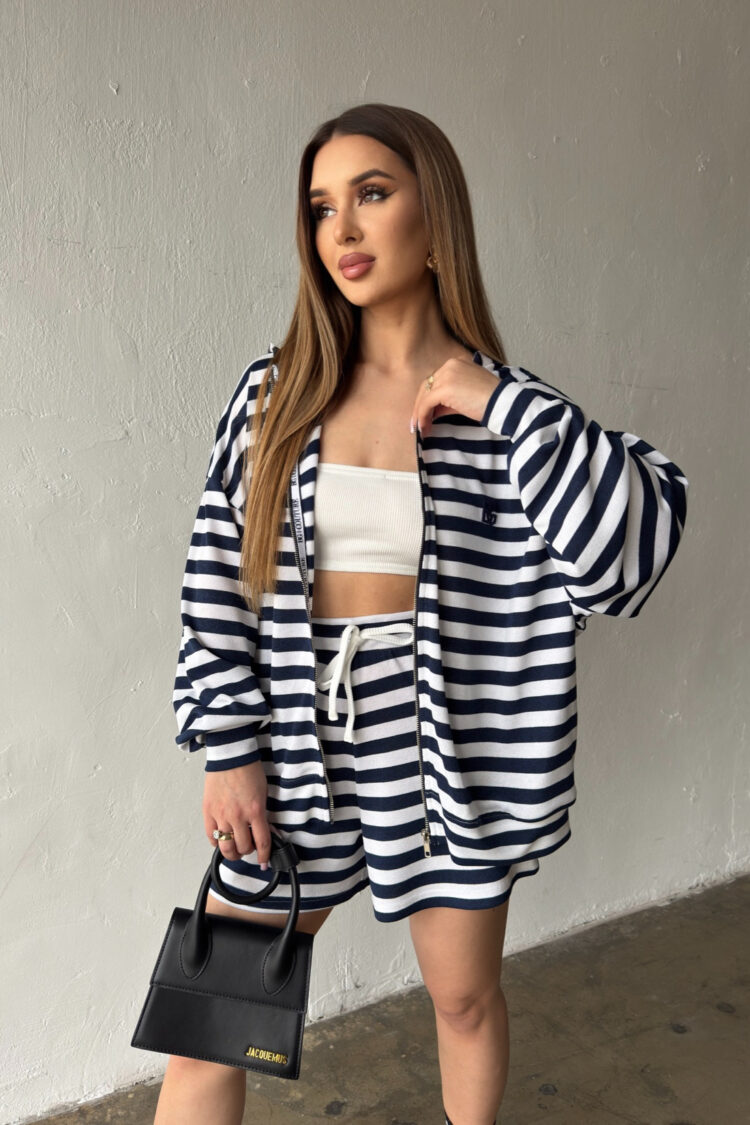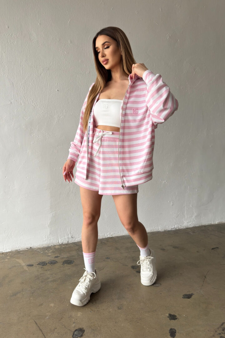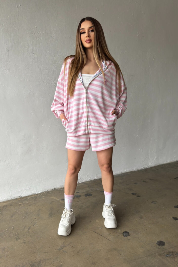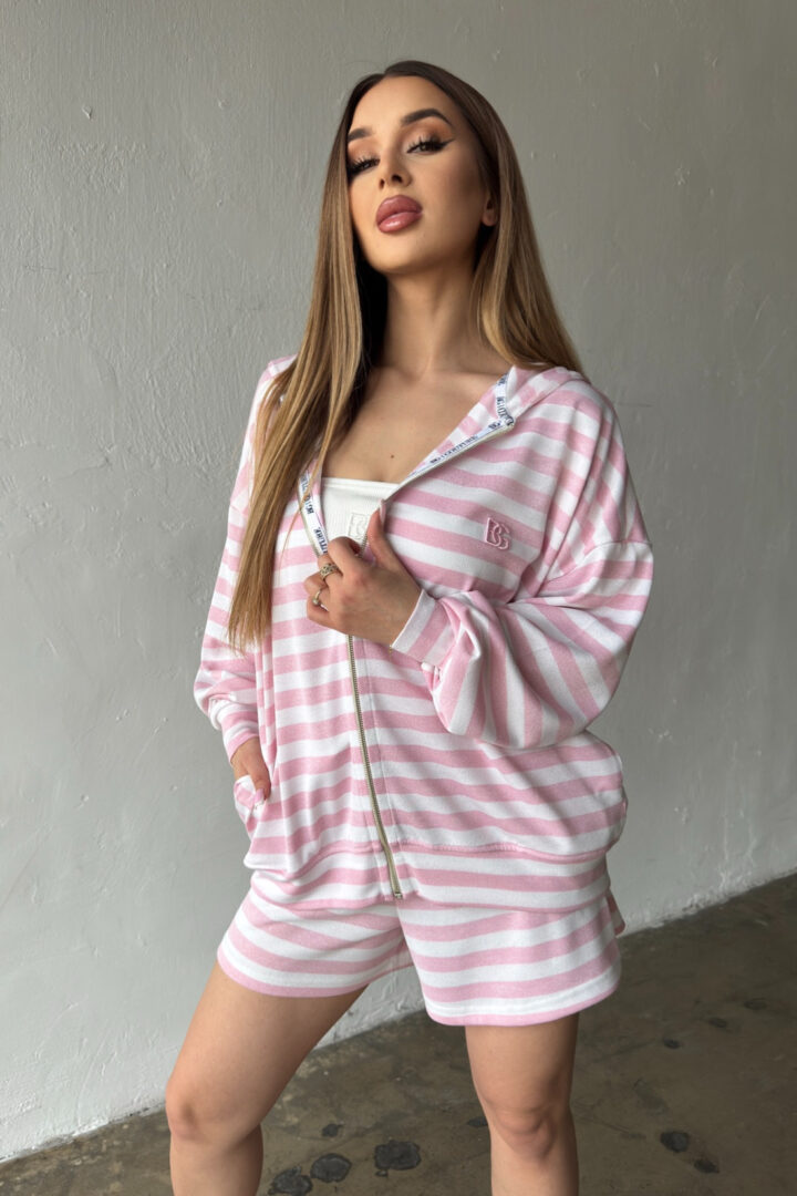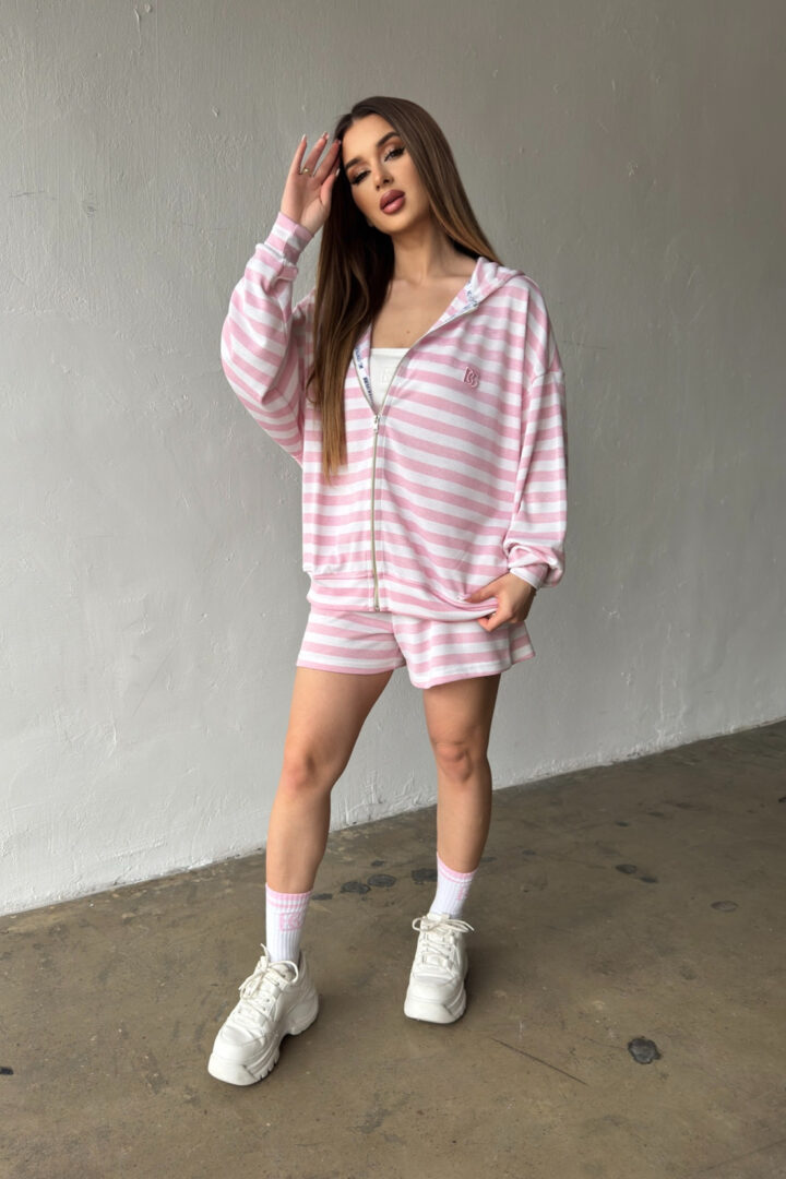 Opis produktu: Bluza damska BG MILKA z wysokiej jakości wiskozowej dzianiny sweterkowej. Bluza o luźnym kroju, rozpinana kangurka z kapturem. Na sercu logowanie monogramem BG w tonacji pasków. Model oversize.