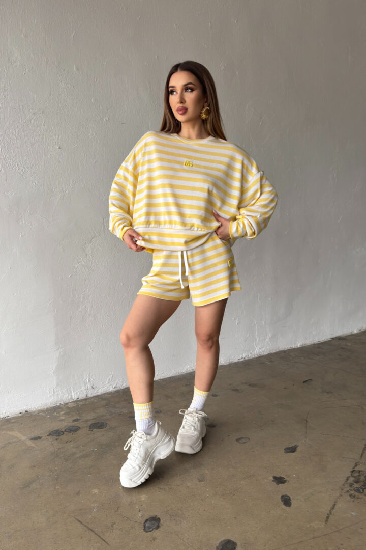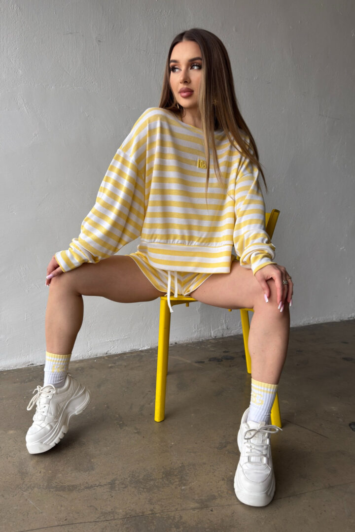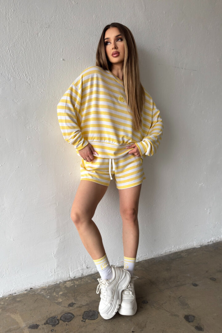 Opis produktu: Bluza damska BG PORTA z wysokiej jakości wiskozowej dzianiny sweterkowej. Bluza o luźnym kroju, bez kaptura. Na środku bluzy logowanie monogramem BG w tonacji pasków. Model oversize.