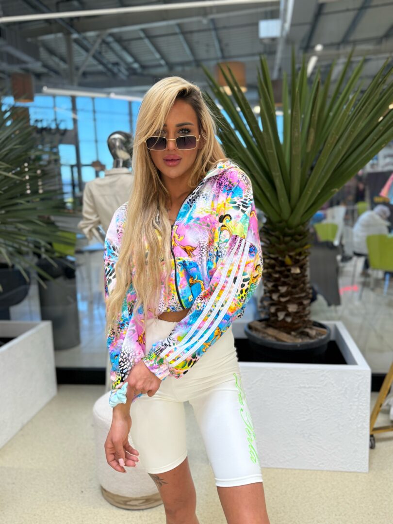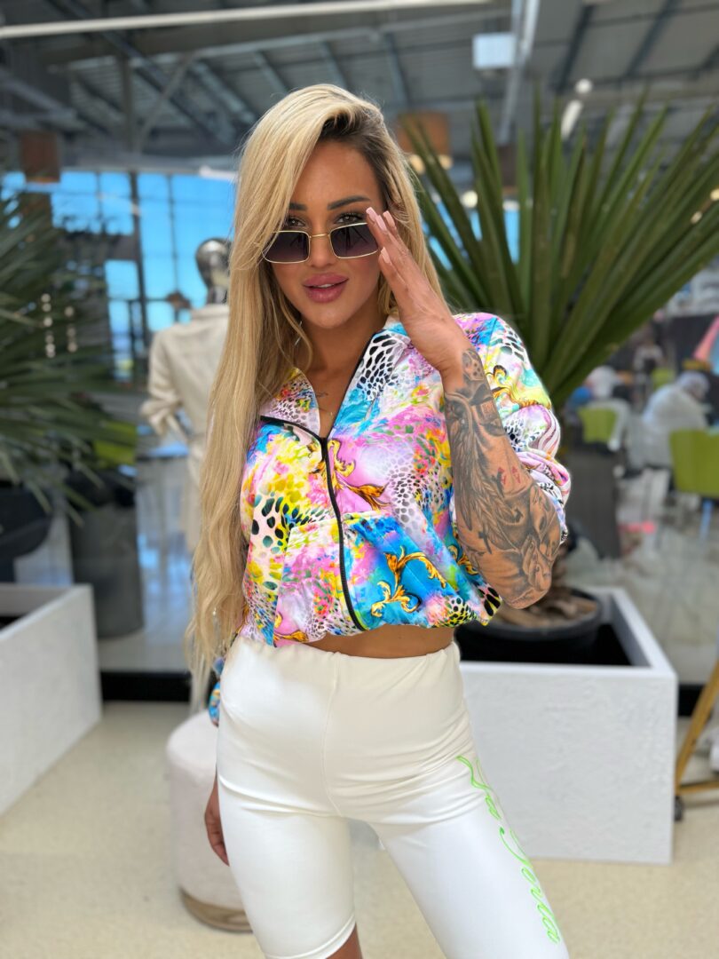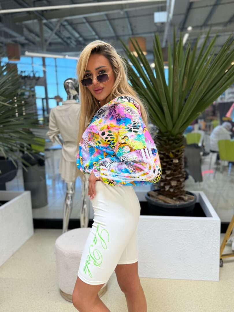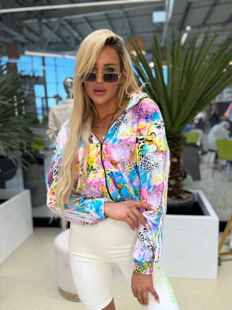 Lekka, sportowa bluza o nowoczesnym kroju, zapinana na zamek, z kapturem i praktycznymi kieszeniami. Model wyróżnia się dynamicznym wzorem oraz charakterystycznymi lampasami na rękawach, które nadają całości modowego charakteru. Rękawy zakończone delikatnym ściągaczem, co zapewnia wygodę noszenia i dobre dopasowanie. Idealna propozycja do codziennych stylizacji – zarówno w sportowym, jak i casualowym wydaniu.