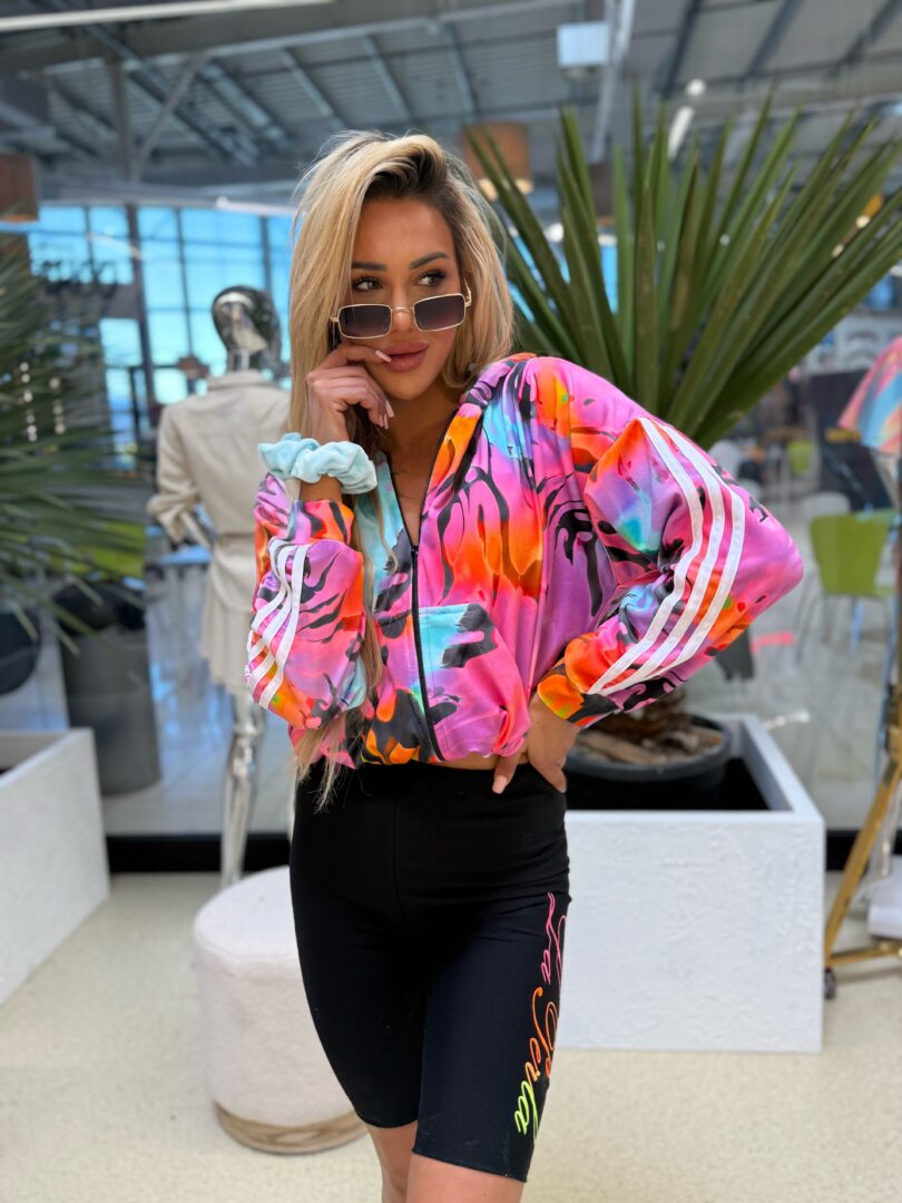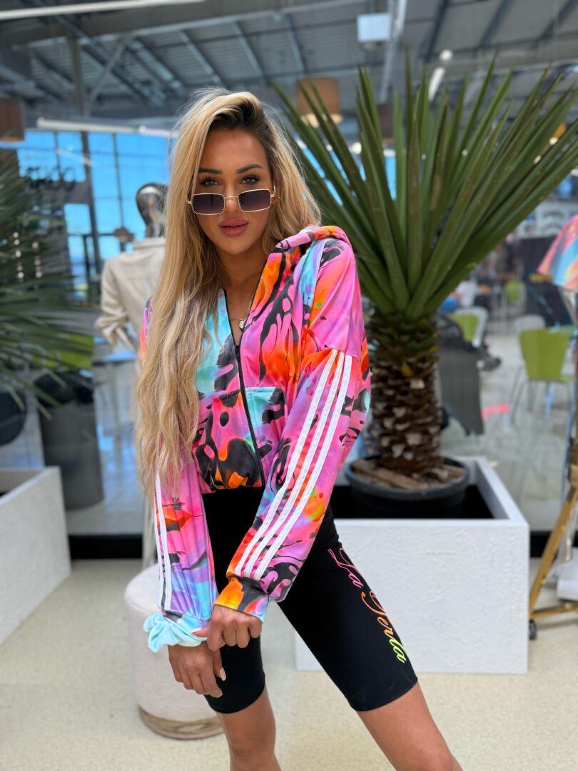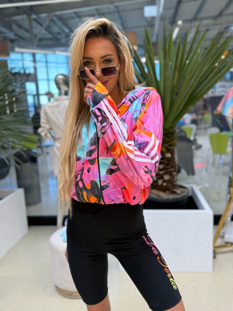 Lekka, sportowa bluza o nowoczesnym kroju, zapinana na zamek, z kapturem i praktycznymi kieszeniami. Model wyróżnia się dynamicznym wzorem oraz charakterystycznymi lampasami na rękawach, które nadają całości modowego charakteru. Rękawy zakończone delikatnym ściągaczem, co zapewnia wygodę noszenia i dobre dopasowanie. Idealna propozycja do codziennych stylizacji – zarówno w sportowym, jak i casualowym wydaniu.