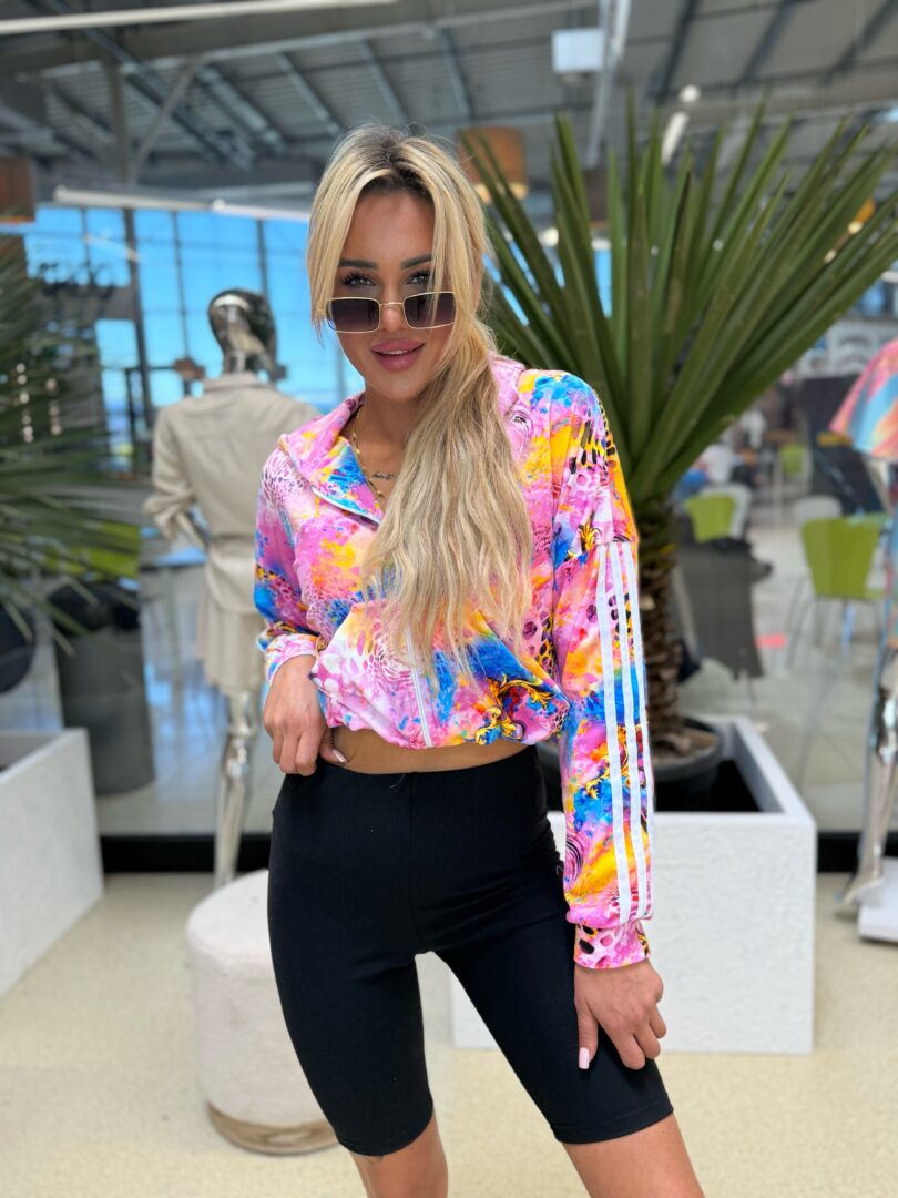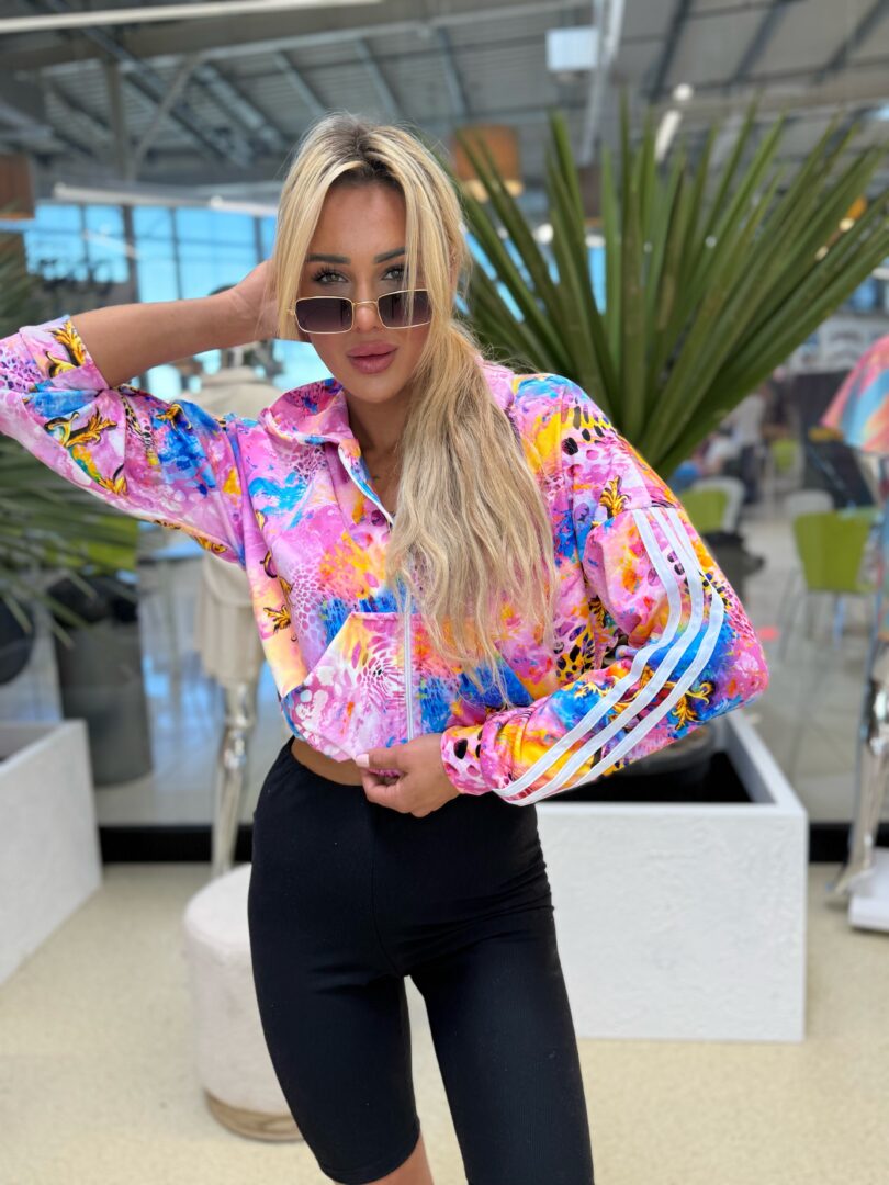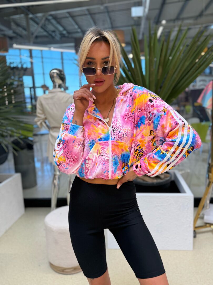 Lekka, sportowa bluza o nowoczesnym kroju, zapinana na zamek, z kapturem i praktycznymi kieszeniami. Model wyróżnia się dynamicznym wzorem oraz charakterystycznymi lampasami na rękawach, które nadają całości modowego charakteru. Rękawy zakończone delikatnym ściągaczem, co zapewnia wygodę noszenia i dobre dopasowanie. Idealna propozycja do codziennych stylizacji – zarówno w sportowym, jak i casualowym wydaniu.