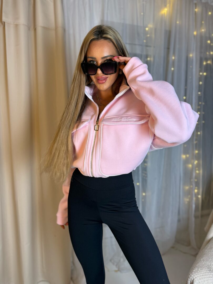 Krój oversize. Wykonanie z przyjemnej tkaniny. Obszerne rękawy z kieszonkami. Ściągacz u dołu.
