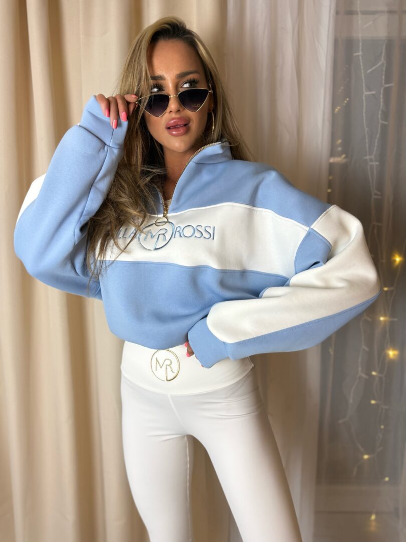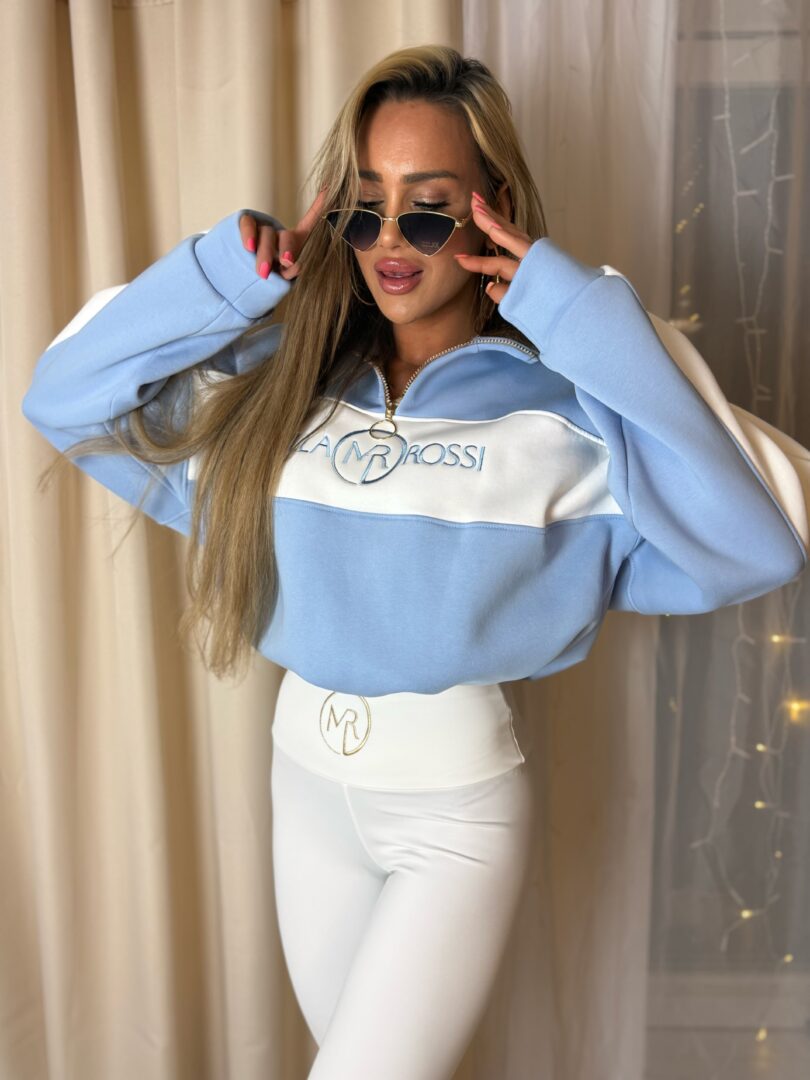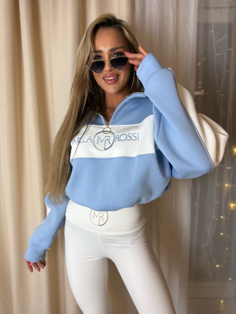 Bluza o luźniejszym kroju, zakładana przez głowę, z krótkim zamkiem przy dekolcie. Posiada obniżoną linię ramion oraz długie rękawy zakończone ściągaczami. Przód zdobiony efektownym panelem z haftowanym logo, który nadaje całości modowego akcentu. Materiał jest miękki, elastyczny i przyjemny w dotyku, zapewniając komfort noszenia.