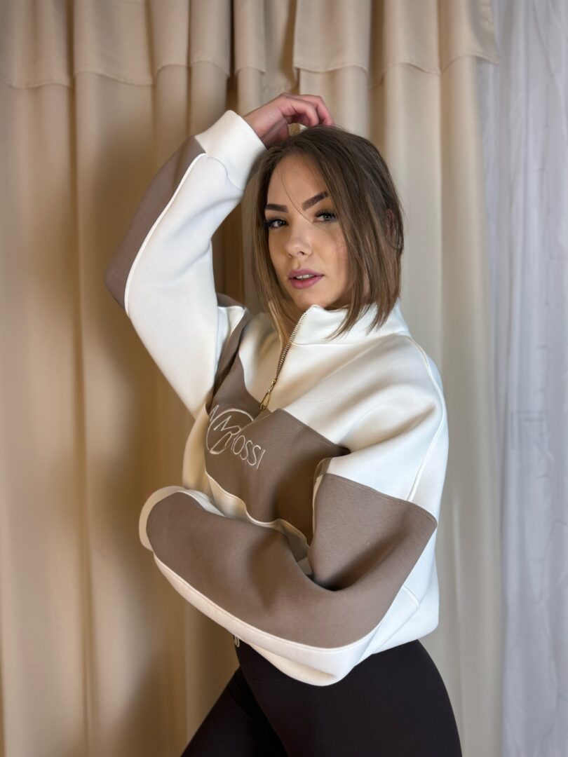 Bluza o luźniejszym kroju, zakładana przez głowę, z krótkim zamkiem przy dekolcie. Posiada obniżoną linię ramion oraz długie rękawy zakończone ściągaczami. Przód zdobiony efektownym panelem z haftowanym logo, który nadaje całości modowego akcentu. Materiał jest miękki, elastyczny i przyjemny w dotyku, zapewniając komfort noszenia.