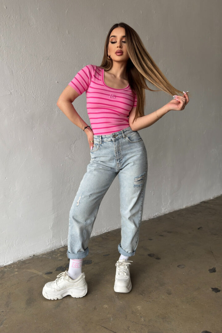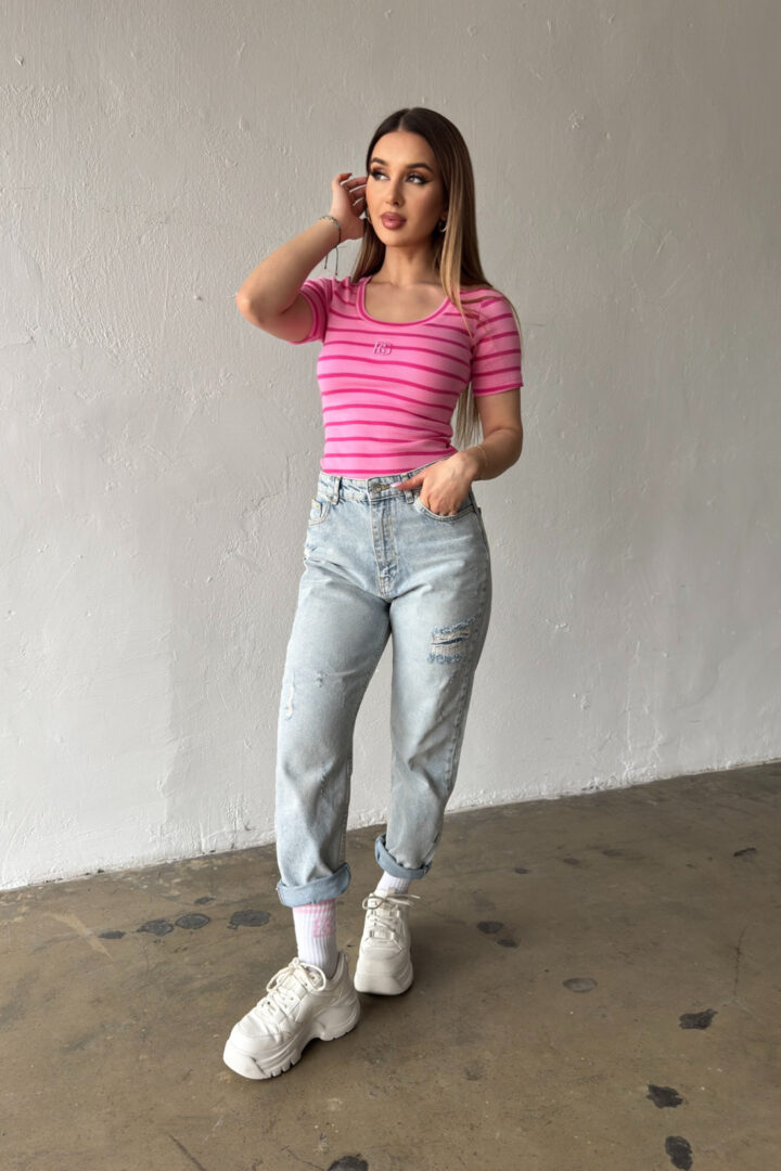 Opis produktu: Bluzka damska BG SISI z elastycznego bawełnianego ściągacza dzianego fabrycznie w paski. Bluzka z krótkim rękawem, dekold okrągły, klasyczne logowanie marki BG w 3D na środku.
