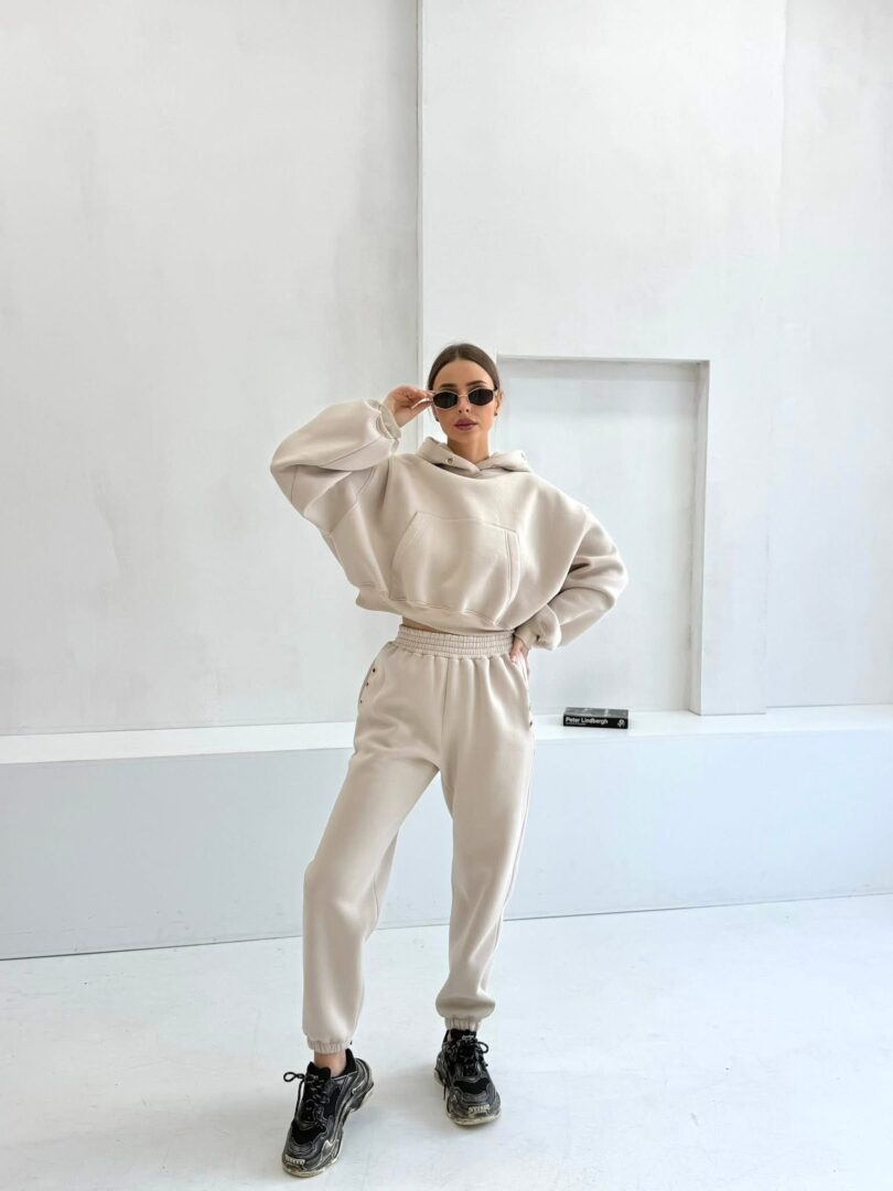 Stylowy komplet dresowy składający się z bluzy z kapturem oraz spodni o luźnym, komfortowym kroju. Wykonany z miękkiego, przyjemnego w dotyku materiału, który zapewnia wygodę noszenia przez cały dzień. Bluza posiada klasyczną kieszeń typu kangurka oraz kaptur z dekoracyjnymi napami, co nadaje całości nowoczesnego charakteru.
