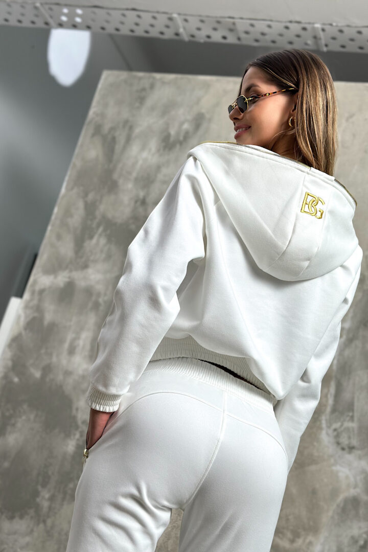 Opis produktu: Komplet zamszowy BG NEW ESSENTIAL w kolorze białym. Rozpinana bluza z kapturem ozdobiona złotym haftem BG na piersi oraz złotym haftem z logo marki na kapturze. Złoty, metalowy suwak wszyty również na kapturze dookoła głowy. Spodnie posiadają gumkę w pasie oraz złote, metalowe suwaki w kieszeniach. Na środku paska w spodniach haftowane logo marki BG. Spodnie oraz bluza posiadają ozdobne przeszycia. Spodnie modelujące sylwetkę.