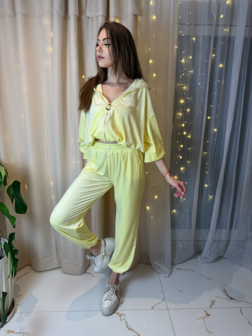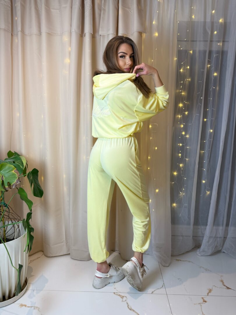 Stylowy komplet dresowy, który łączy wygodę z modnym designem. Bluza ma luźniejszy krój z kapturem, długim rękawem zakończonym gumką oraz praktycznym suwakiem. Z przodu umieszczono subtelny haft z napisem, co dodaje całości eleganckiego charakteru. Spodnie posiadają elastyczną gumkę w pasie ze sznurkiem regulacyjnym, dzięki czemu idealnie dopasowują się do sylwetki. Materiał jest miękki, przyjemny w dotyku i doskonale sprawdzi się zarówno na co dzień, jak i w bardziej sportowych stylizacjach.