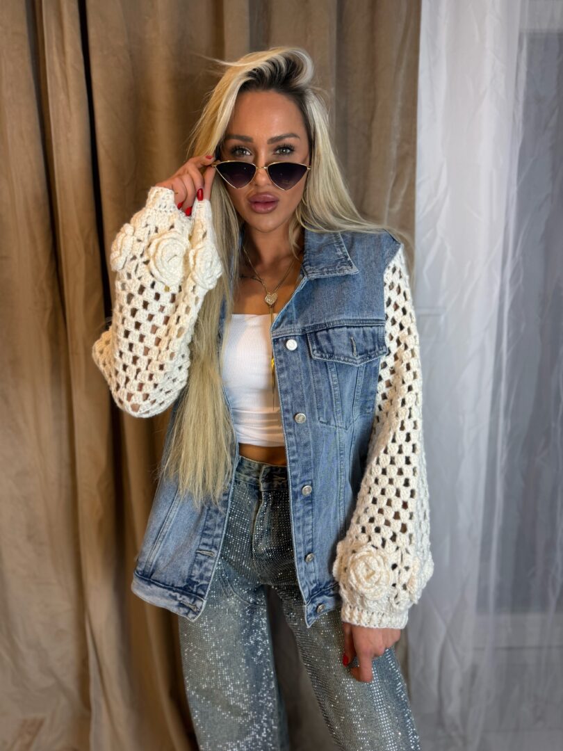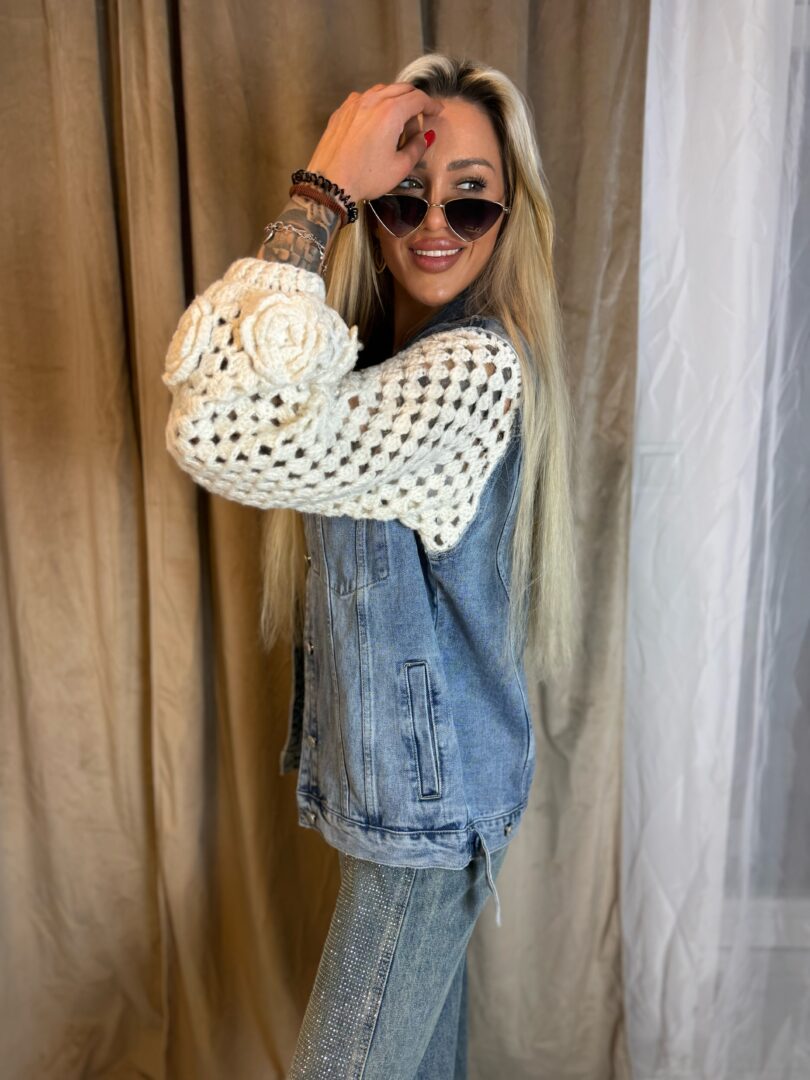 Wyjątkowa katana, która łączy klasyczny jeans z efektownymi, ażurowymi rękawami, tworząc niezwykle modowy i kobiecy fason. Denimowa część nadaje jej ponadczasowego charakteru, natomiast rękawy wykonane z ozdobnego, plecionego materiału dodają lekkości i oryginalności całej stylizacji.