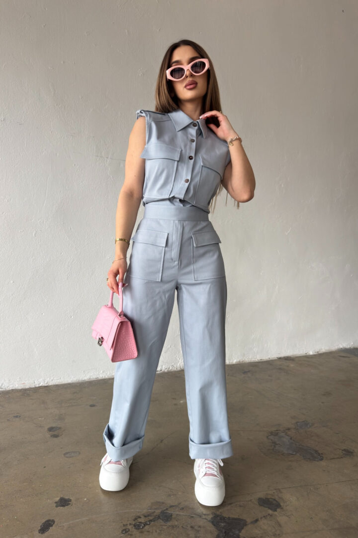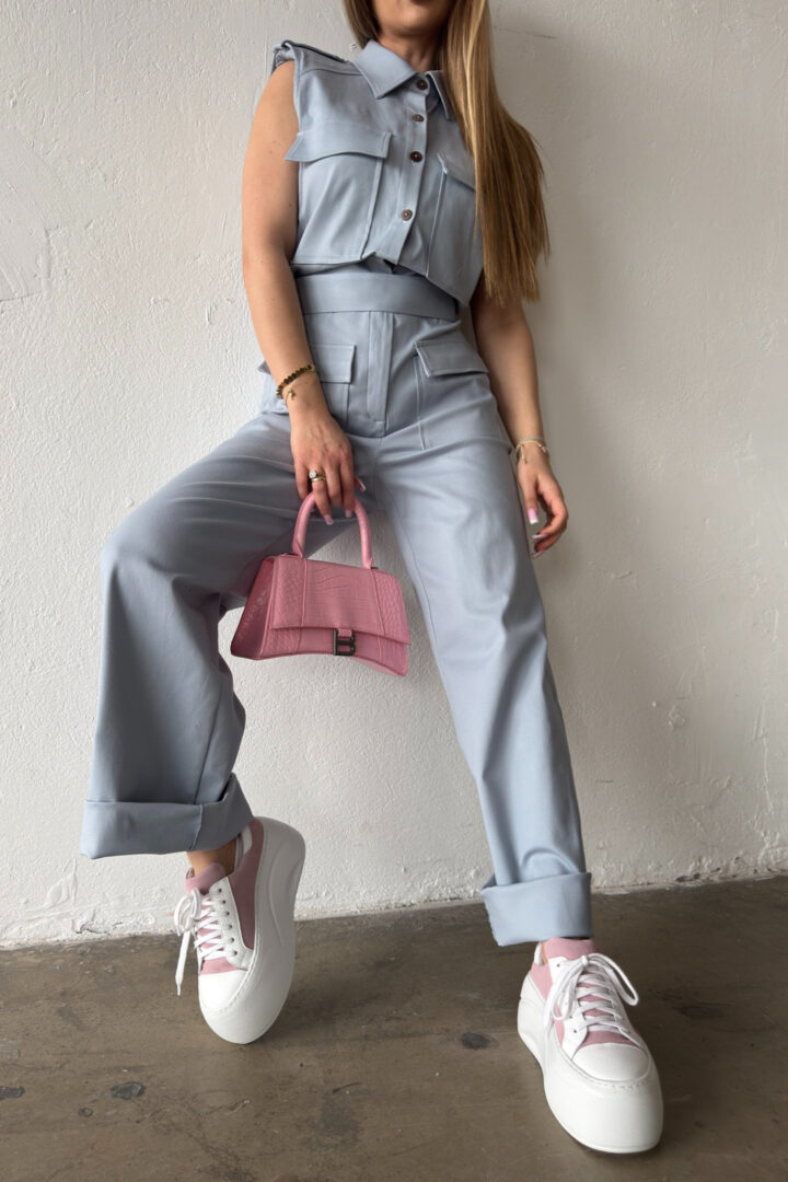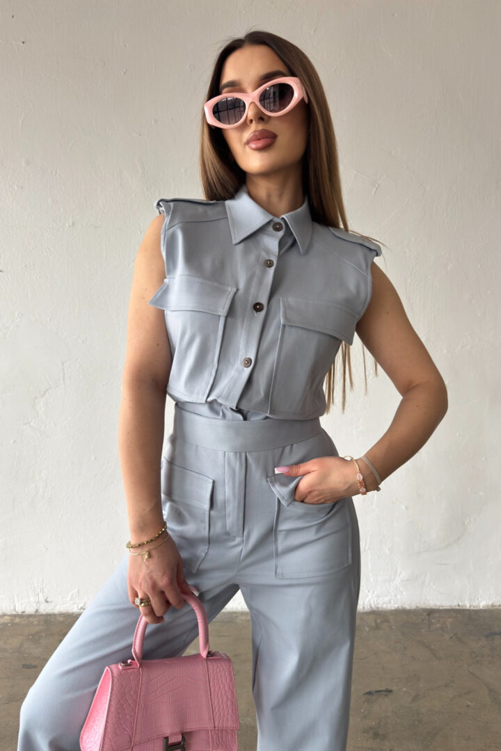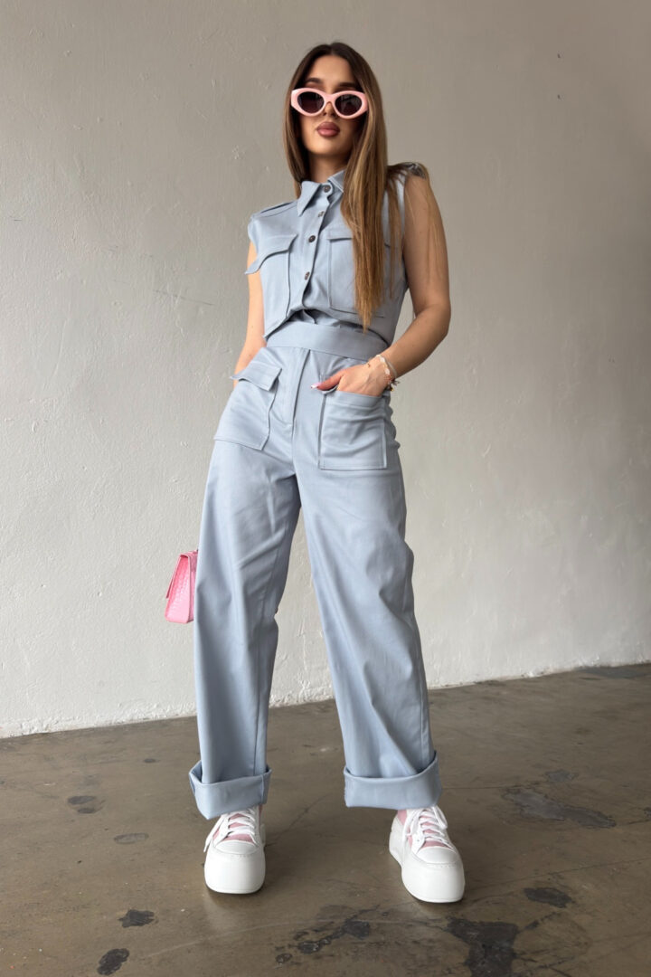 Opis produktu: Kombinezon damski BG MANGO z bawełnianego jeansu. Model zapinany na suwak oraz kokosowe guziki. Pasek w zestawie do wiązania. Prosta nogawka. Logowanie marką BG na plecach. Poduszki w ramionach. Model kombinezonu świetnie sprawdzi się do casualowych oraz eleganckich stylizacji.