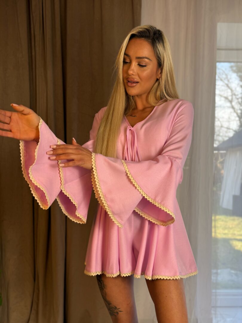 Komplet składający się ze spódniczko-spodenek oraz lekkiej, zwiewnej bluzki. Góra z delikatnym wiązaniem przy dekolcie, który subtelnie podkreśla sylwetkę. Rękawy długie, rozszerzane, zakończone ozdobną lamówką, nadającą całości kobiecego i romantycznego charakteru.