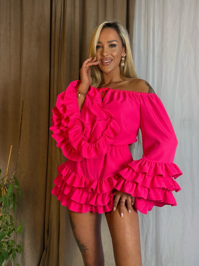 Rozkloszowany dół z wielowarstwowymi falbanami pięknie układa się w ruchu i eksponuje nogi. Szerokie rękawy zakończone falbanami nadają stylizacji objętości i wyjątkowego efektu.