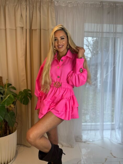 Model składa się z lekkiej, rozkloszowanej góry z efektownym, dużym kołnierzem oraz dopasowanego dołu, który pięknie podkreśla sylwetkę.