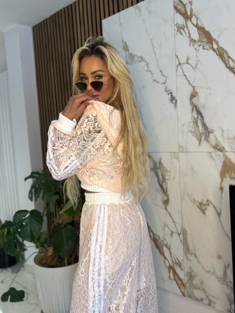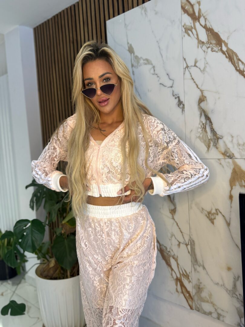 Stylowy komplet o wyjątkowym, kobiecym charakterze, który przyciąga uwagę swoją strukturą i detalami. Bluza zapinana na zamek wykonana z ażurowego materiału pięknie podkreśla sylwetkę, a sportowe lampasy na rękawach nadają całości modowego, streetwearowego klimatu.