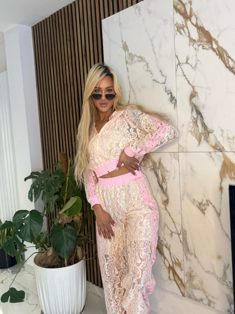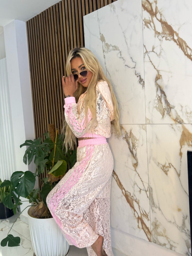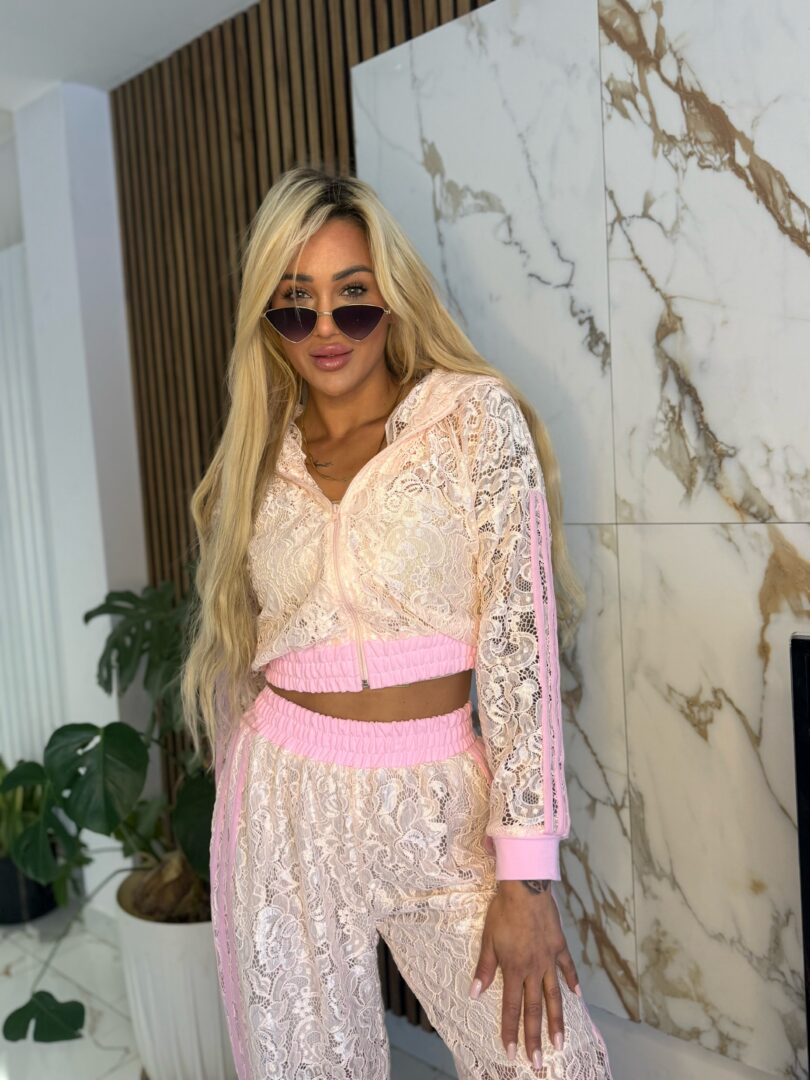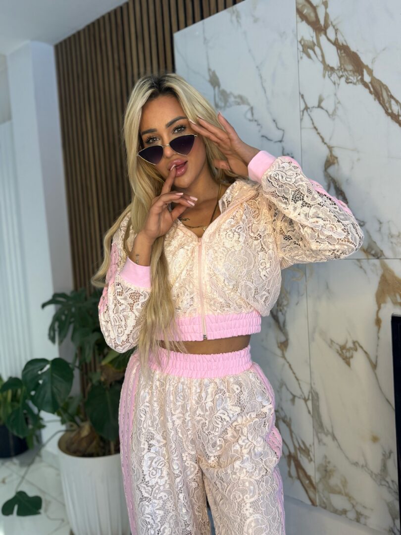 Stylowy komplet o wyjątkowym, kobiecym charakterze, który przyciąga uwagę swoją strukturą i detalami. Bluza zapinana na zamek wykonana z ażurowego materiału pięknie podkreśla sylwetkę, a sportowe lampasy na rękawach nadają całości modowego, streetwearowego klimatu.
