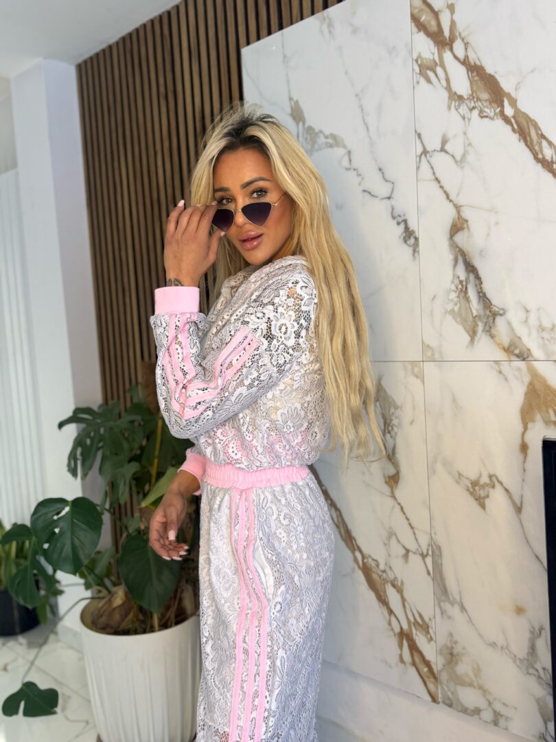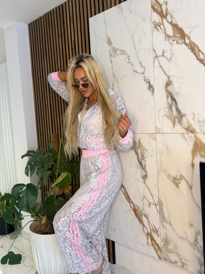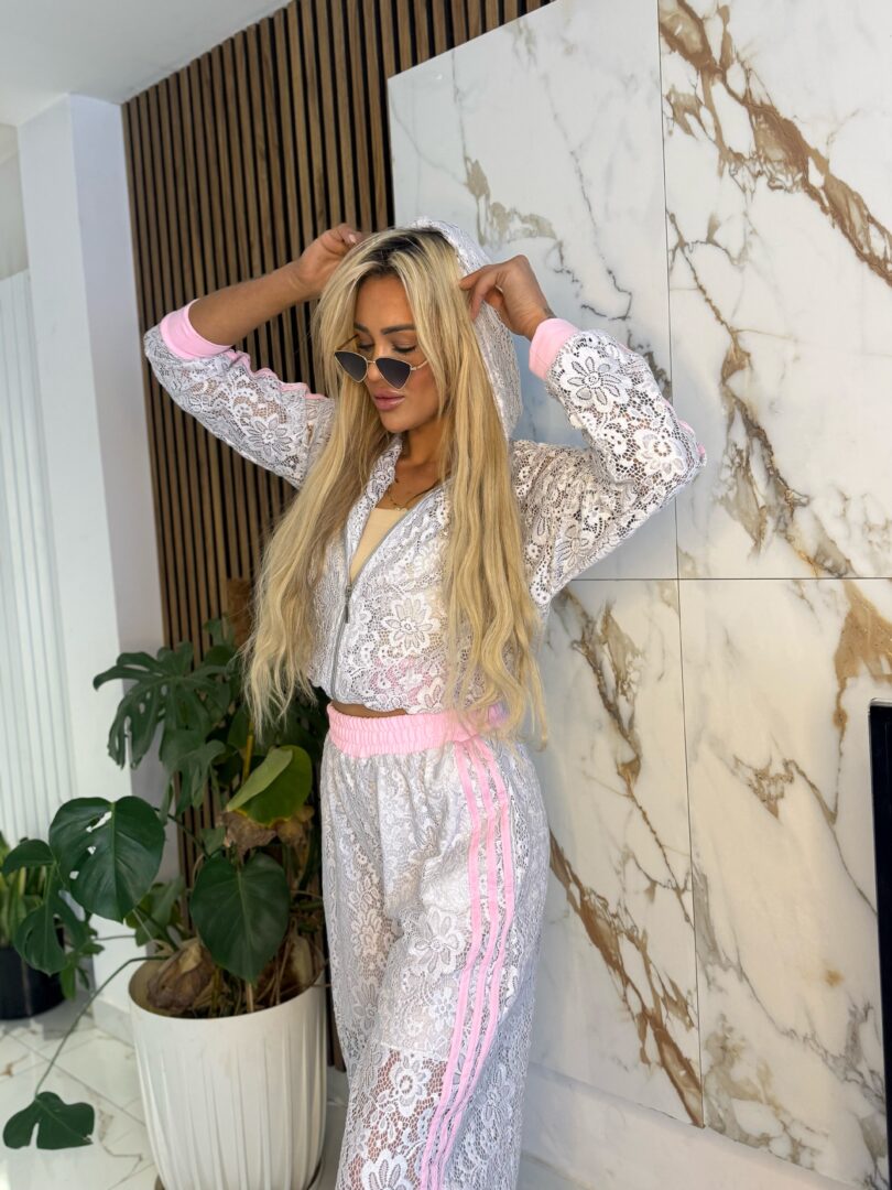 Stylowy komplet o wyjątkowym, kobiecym charakterze, który przyciąga uwagę swoją strukturą i detalami. Bluza zapinana na zamek wykonana z ażurowego materiału pięknie podkreśla sylwetkę, a sportowe lampasy na rękawach nadają całości modowego, streetwearowego klimatu.