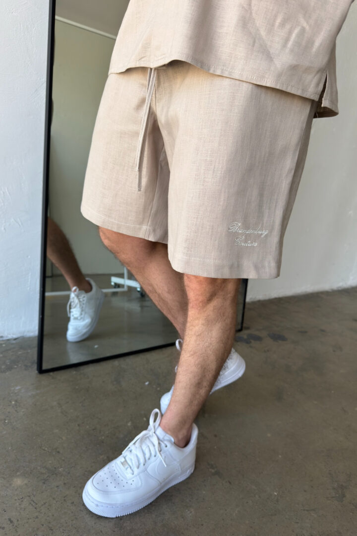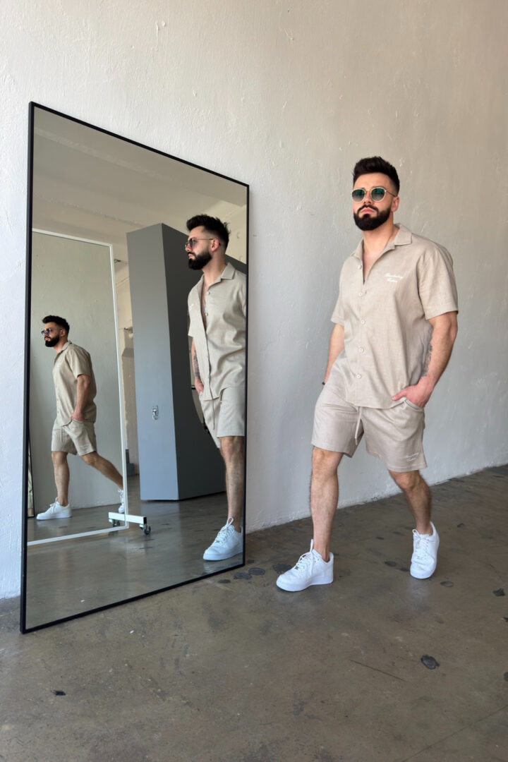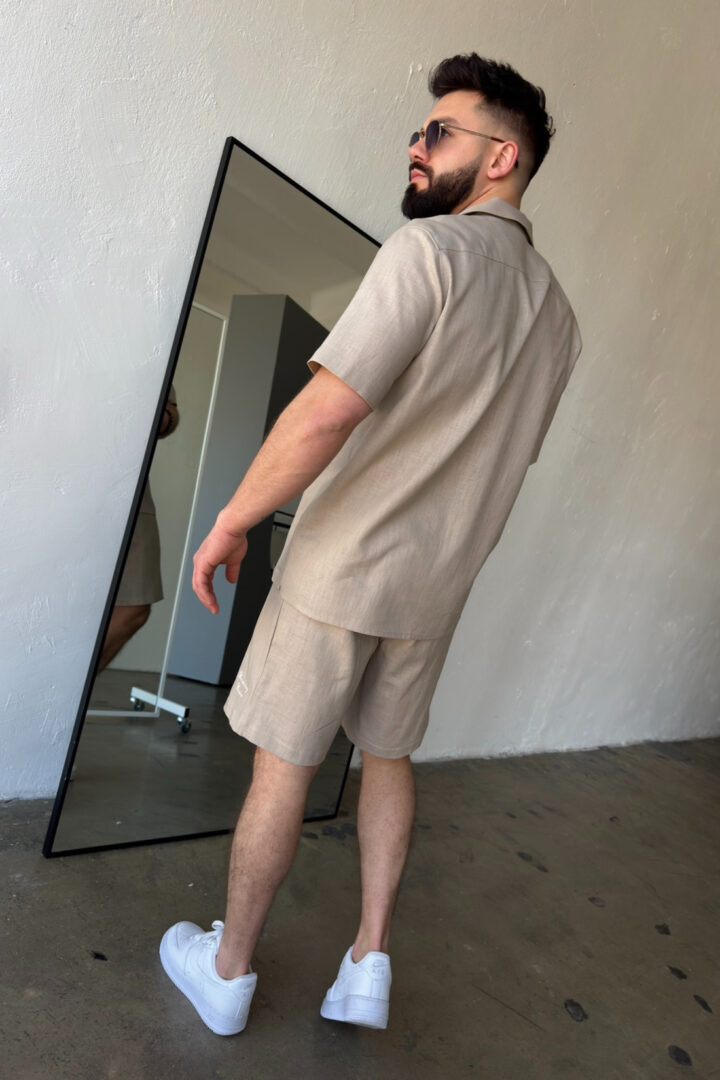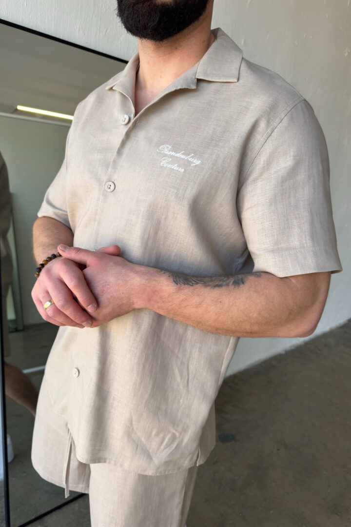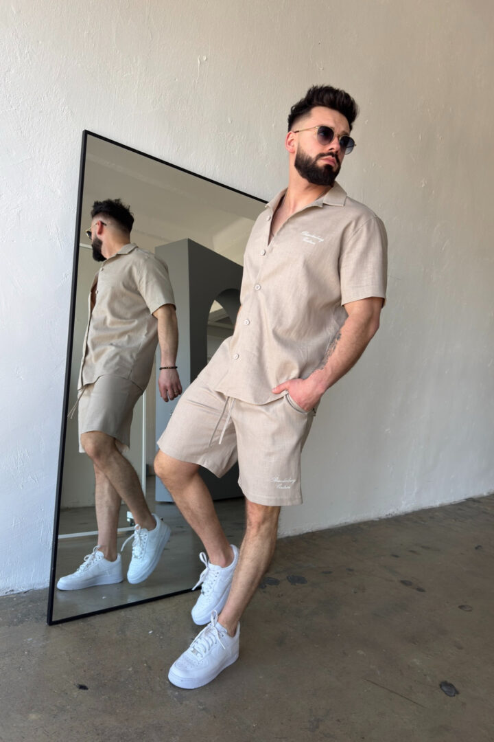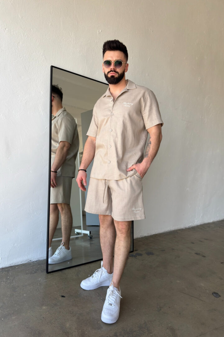 Opis produktu: Komplet lniany męski BG LATINO. Koszula oraz spodnie wykonane z wysokiej jakości lnianej tkaniny z domieszką bawełny. Koszula o luźnym kroju z krótkim rękawem zapinana na guziki. Szorty również o luźnym kroju. Posiadają gumkę oraz sznurek w pasie. Koszula oraz szorty ozdobione odręcznie pisaną nazwą marki BG Brandenburg Couture przeniesioną na produkt techniką haftu.