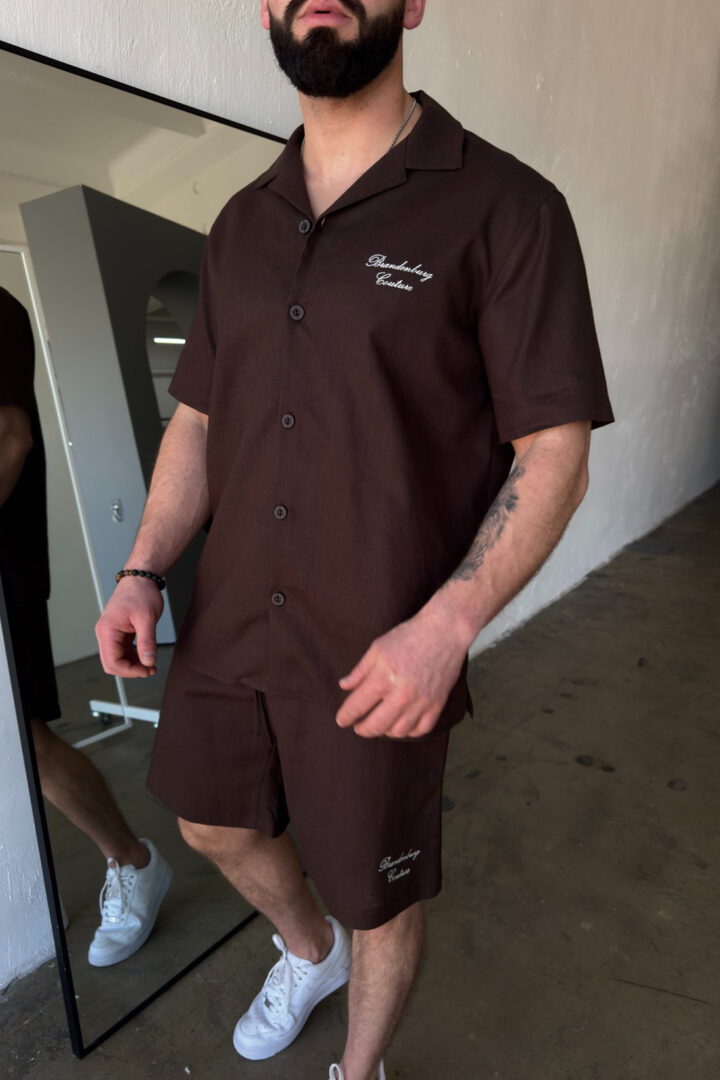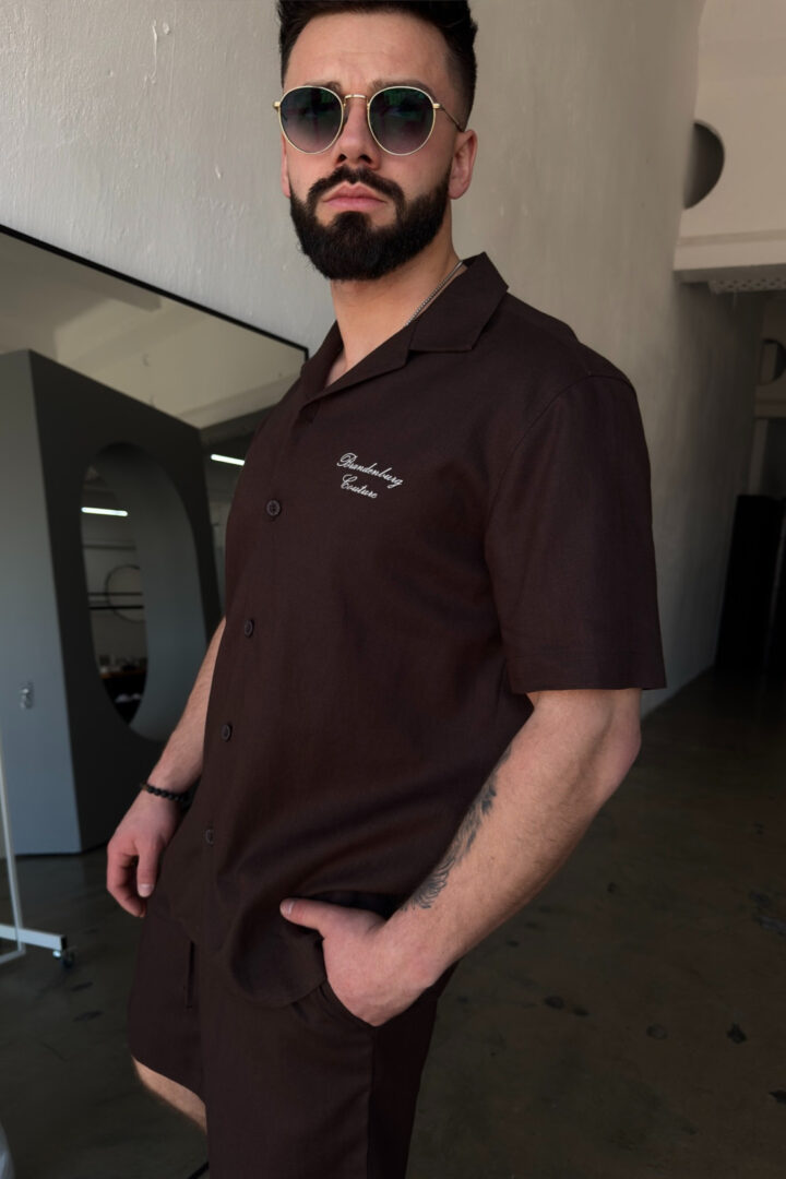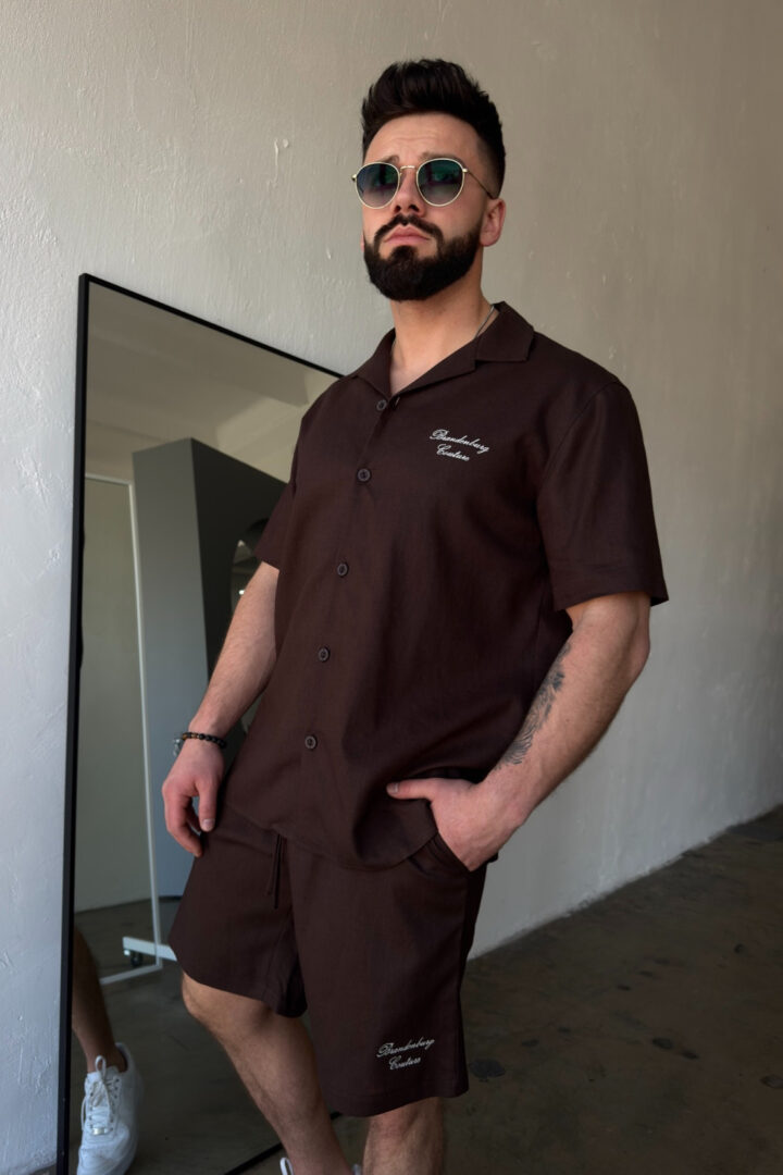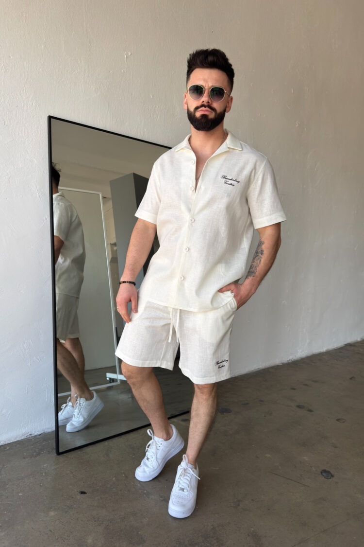 Opis produktu: Komplet lniany męski BG LATINO. Koszula oraz spodnie wykonane z wysokiej jakości lnianej tkaniny z domieszką bawełny. Koszula o luźnym kroju z krótkim rękawem zapinana na guziki. Szorty również o luźnym kroju. Posiadają gumkę oraz sznurek w pasie. Koszula oraz szorty ozdobione odręcznie pisaną nazwą marki BG Brandenburg Couture przeniesioną na produkt techniką haftu.