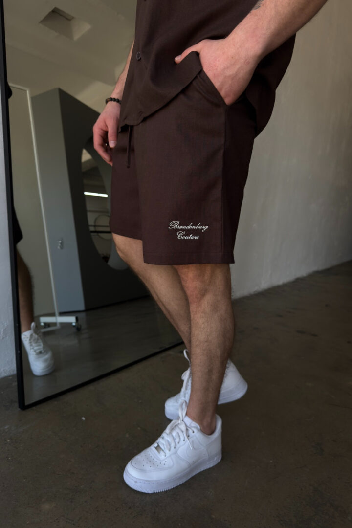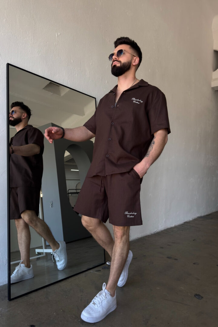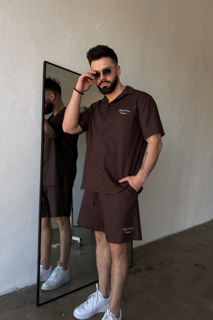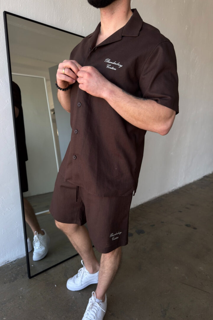 Opis produktu: Komplet lniany męski BG LATINO. Koszula oraz spodnie wykonane z wysokiej jakości lnianej tkaniny z domieszką bawełny. Koszula o luźnym kroju z krótkim rękawem zapinana na guziki. Szorty również o luźnym kroju. Posiadają gumkę oraz sznurek w pasie. Koszula oraz szorty ozdobione odręcznie pisaną nazwą marki BG Brandenburg Couture przeniesioną na produkt techniką haftu.