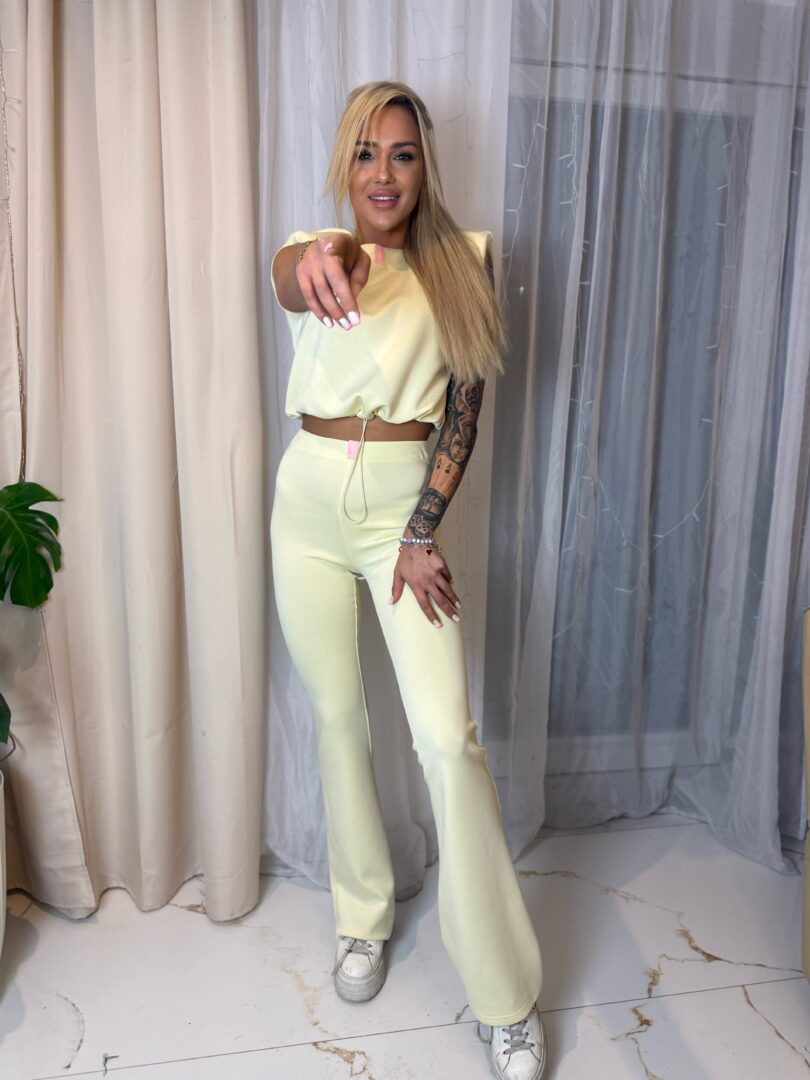 Stylowy, kobiecy komplet składający się z krótkiej bluzki z delikatnie podkreślonym ramieniem oraz dopasowanych spodni z wysokim stanem i subtelnie rozszerzaną nogawką. Model pięknie modeluje sylwetkę, podkreśla talię i wydłuża nogi, dzięki czemu prezentuje się niezwykle elegancko i zmysłowo zarówno na co dzień, jak i na wyjątkowe wyjścia.