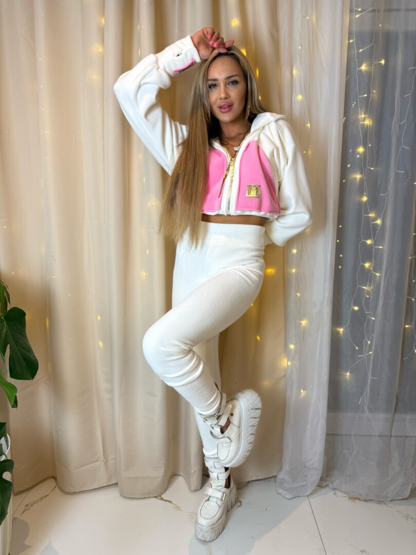 Bluza z kapturem zapinana na zamek, z ozdobną naszywką z logo oraz kontrastowym panelem z przodu, który pięknie podkreśla sylwetkę. Spodnie z wysokim stanem idealnie dopasowują się do figury, modelując talię i biodra.