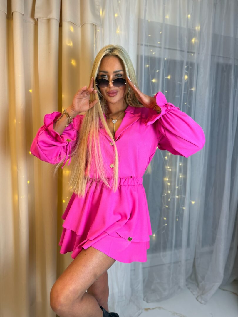 Romantyczny komplet z koszulą i spódniczko-spodenkami to idealna propozycja dla kobiet, które kochają kobiece fasony z nutą wygody. Zestaw składa się z eleganckiej koszuli z długim rękawem oraz krótkiej spódniczki z wszytymi spodenkami, która łączy dziewczęcy look z pełnym komfortem noszenia.