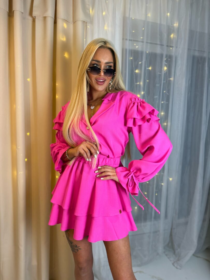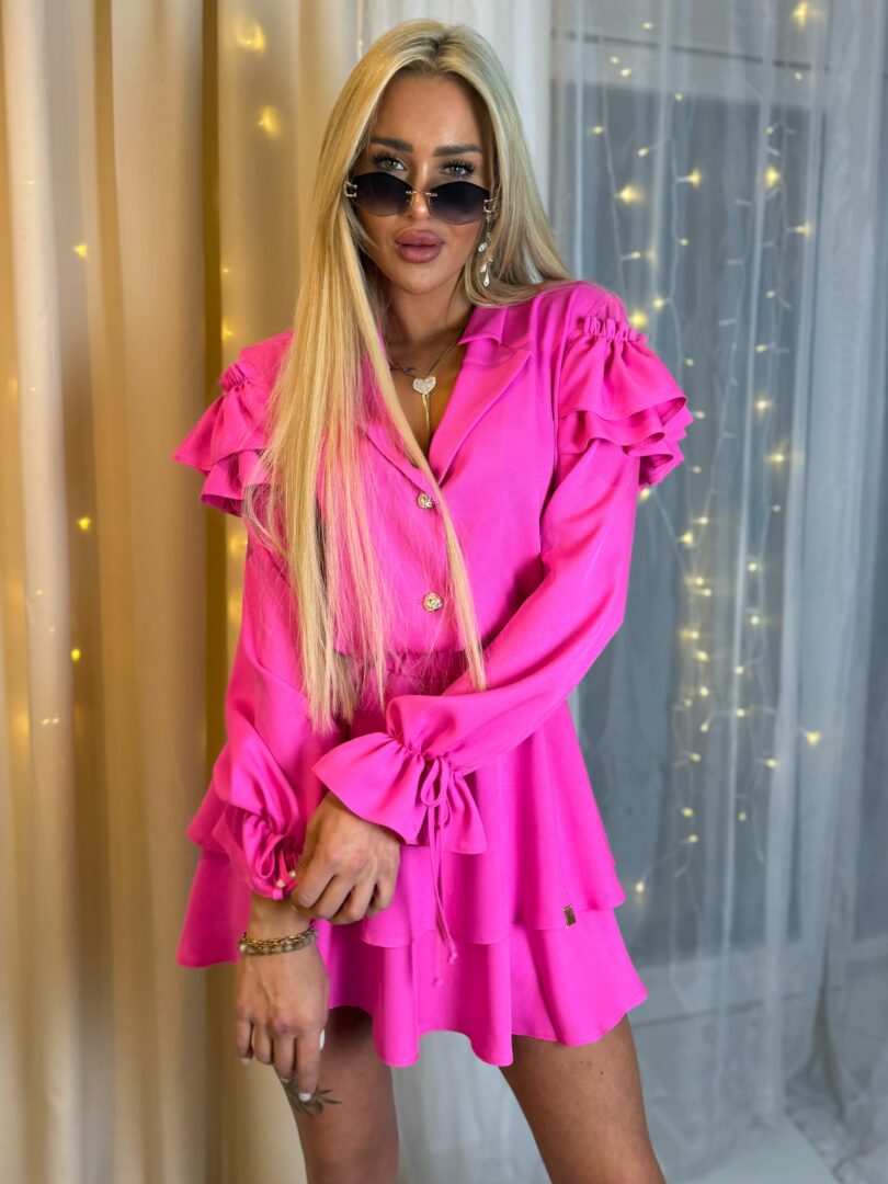 Koszula posiada efektowny dekolt w kształcie litery V oraz ozdobne falbany na ramionach i przy rękawach, które dodają całości lekkości i romantycznego charakteru. Delikatnie taliowany krój pięknie podkreśla sylwetkę.