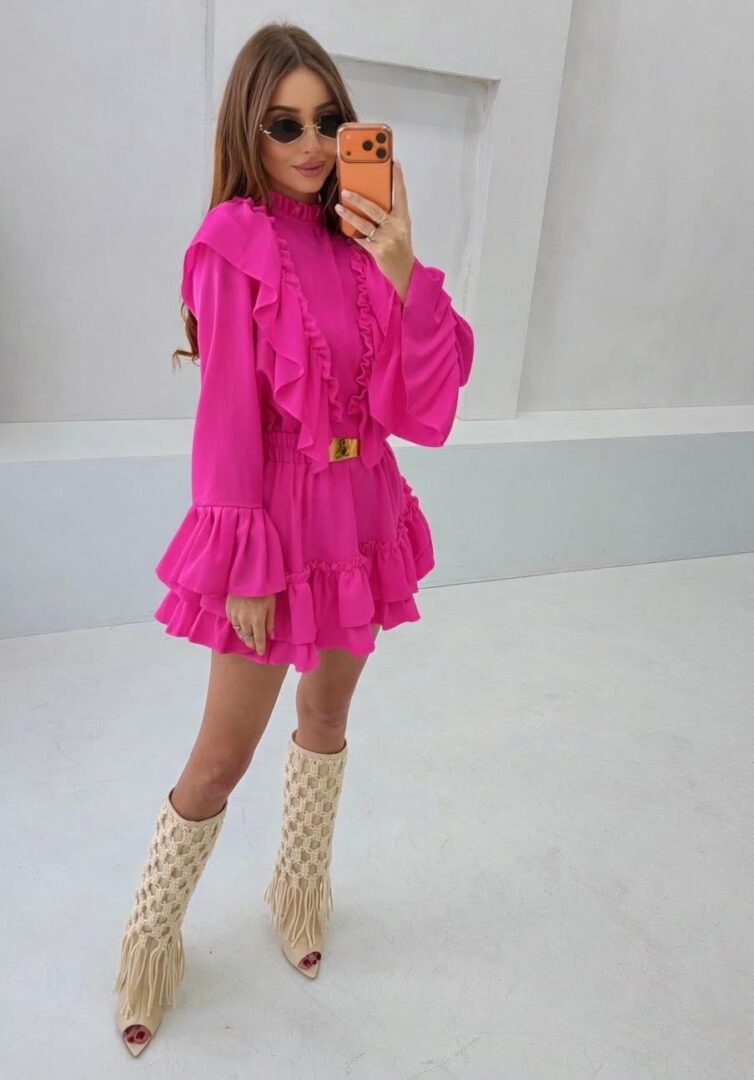 Delikatnie taliowany krój pięknie podkreśla sylwetkę, a elastyczna talia dopasowuje się do figury. Falbanki dodają lekkości i romantycznego charakteru, tworząc bardzo modny, dziewczęcy look.