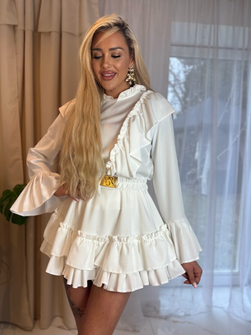 Stylowy komplet z efektem spódniczki to idealne połączenie kobiecego wyglądu i komfortu noszenia. Model składa się z bluzki z długim rękawem, ozdobionej falbanami oraz krótkiej spódniczki z wszytymi spodenkami, dzięki czemu zapewnia pełną swobodę ruchów i wygodę przez cały dzień.