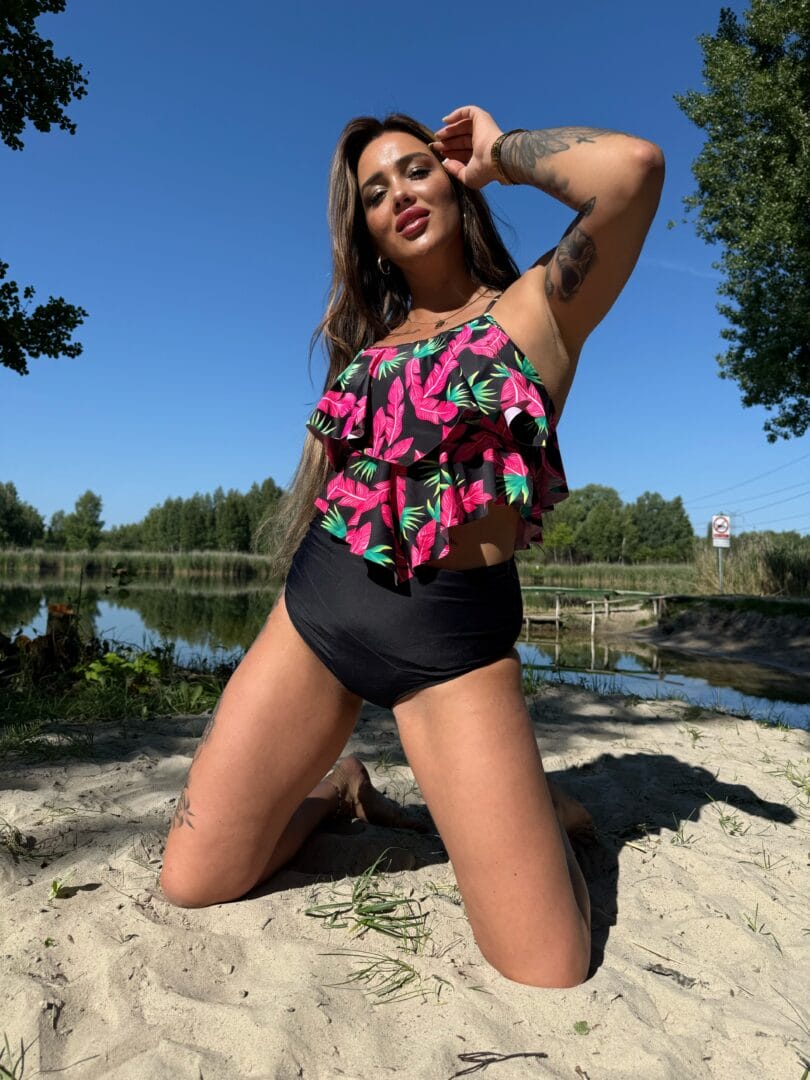 Dwuczęściowy kostium kąpielowy „Blue Tropic” to połączenie wygody, stylu i kobiecego wdzięku. Góra z tropikalnym printem, ozdobiona falbaną, pięknie podkreśla dekolt i ramiona, nadając lekkości całej sylwetce. Regulowane ramiączka zapewniają dopasowanie do każdej figury.