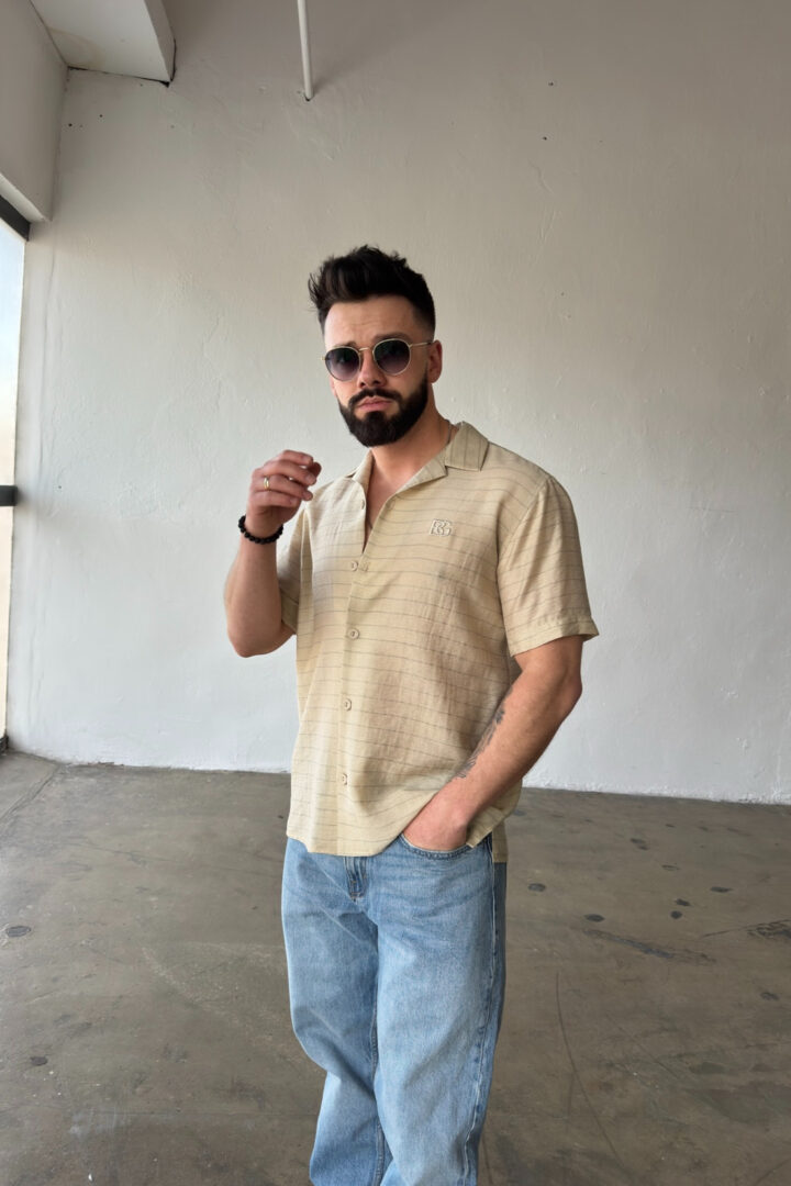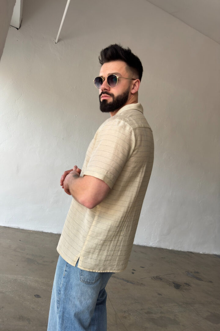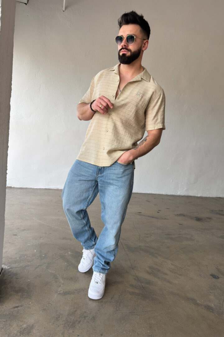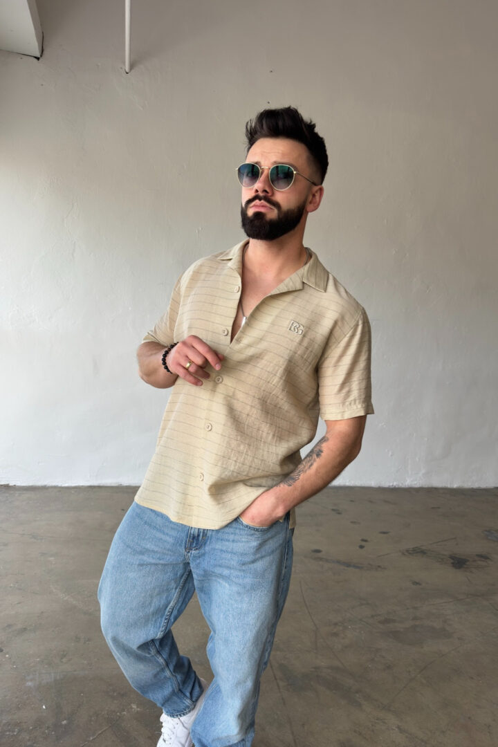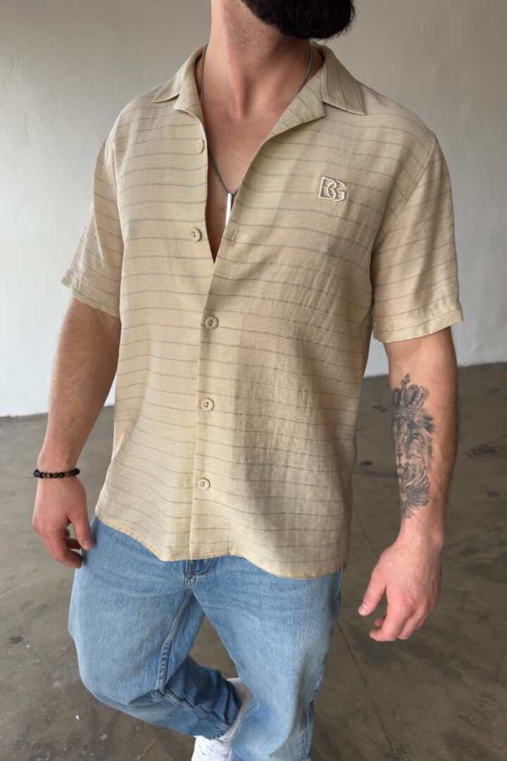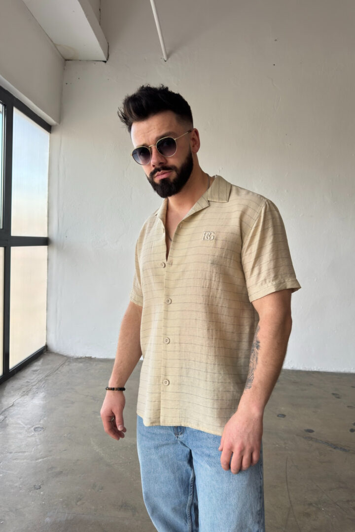 Opis produktu: Koszula męska BG MONSUN. Koszula wykonana z wysokiej jakości tkaniny wiskozowej z domieszką lnu. Koszula bardzo przewiewna o luźnym kroju z krótkim rękawem zapinana na guziki. Koszula ozdobiona haftowanym monogramem BG na sercu.