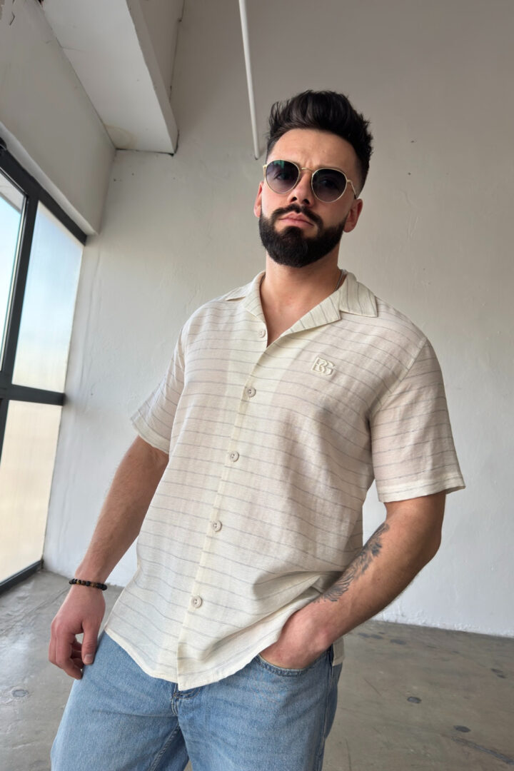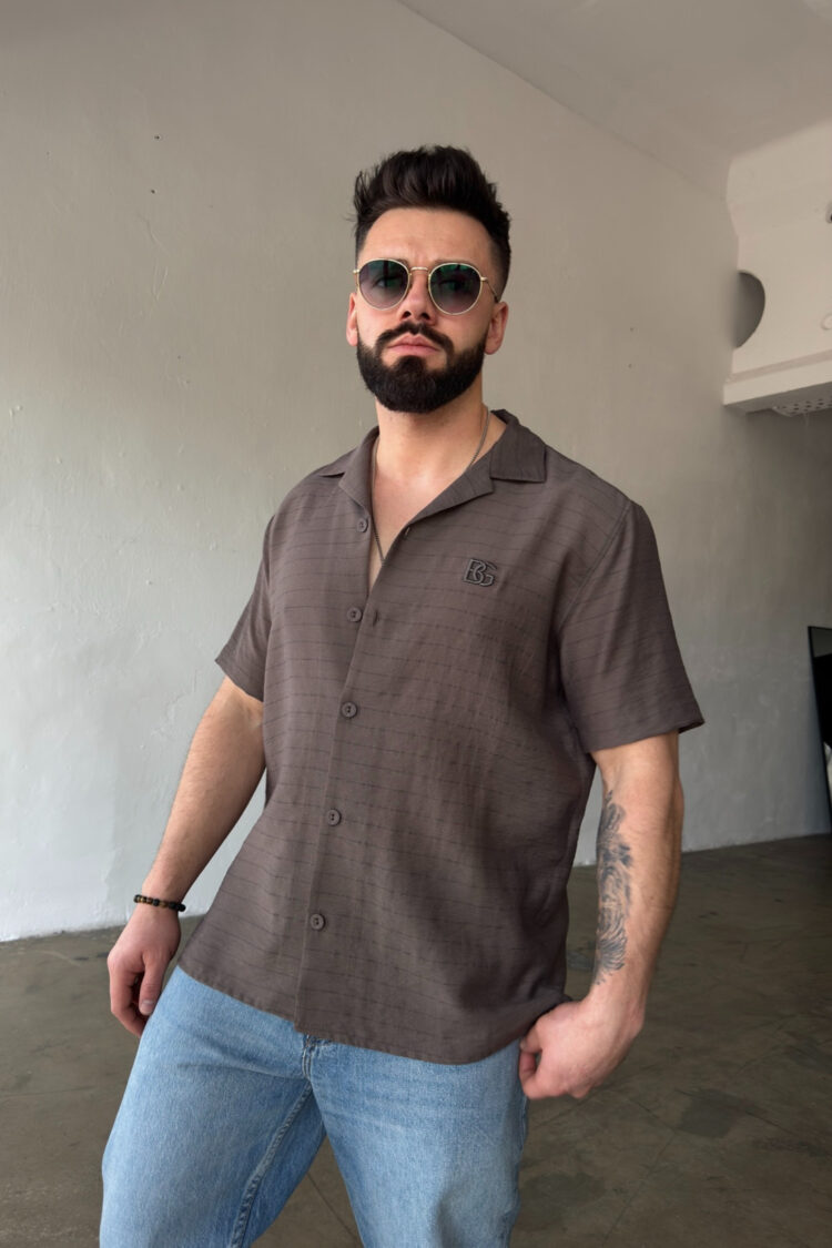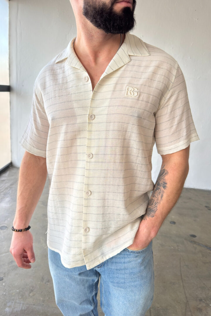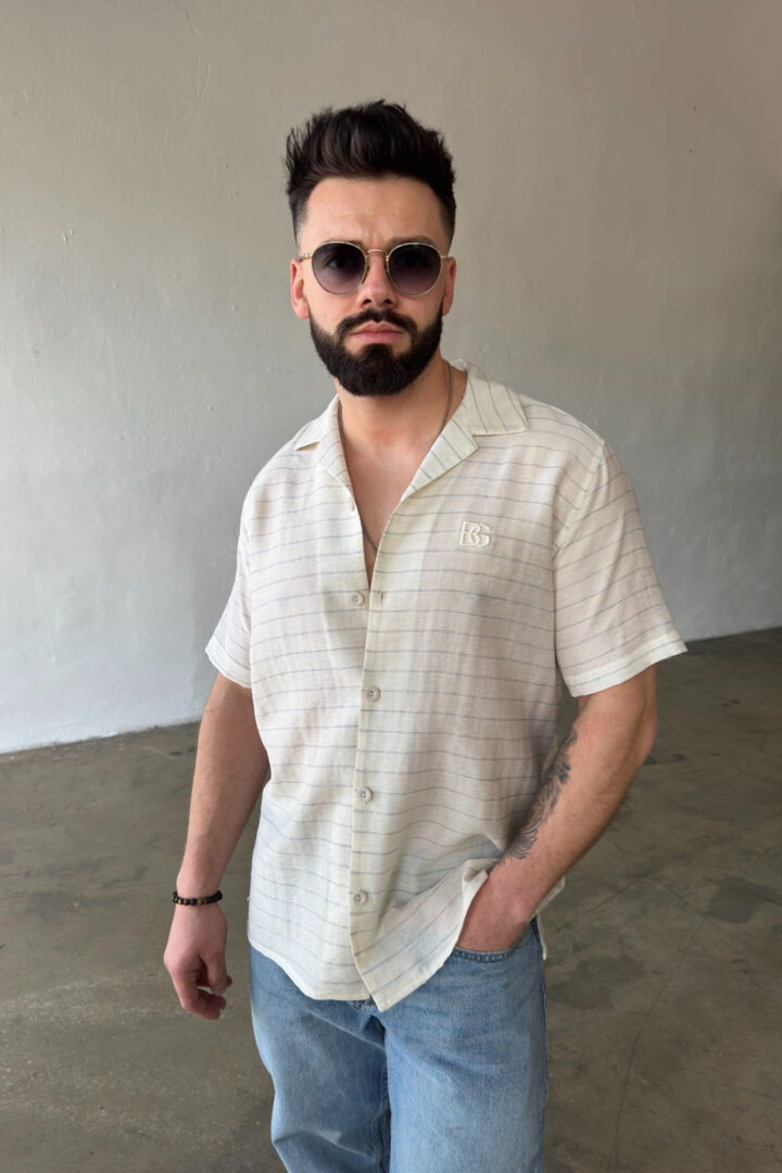 Opis produktu: Koszula męska BG MONSUN. Koszula wykonana z wysokiej jakości tkaniny wiskozowej z domieszką lnu. Koszula bardzo przewiewna o luźnym kroju z krótkim rękawem zapinana na guziki. Koszula ozdobiona haftowanym monogramem BG na sercu.