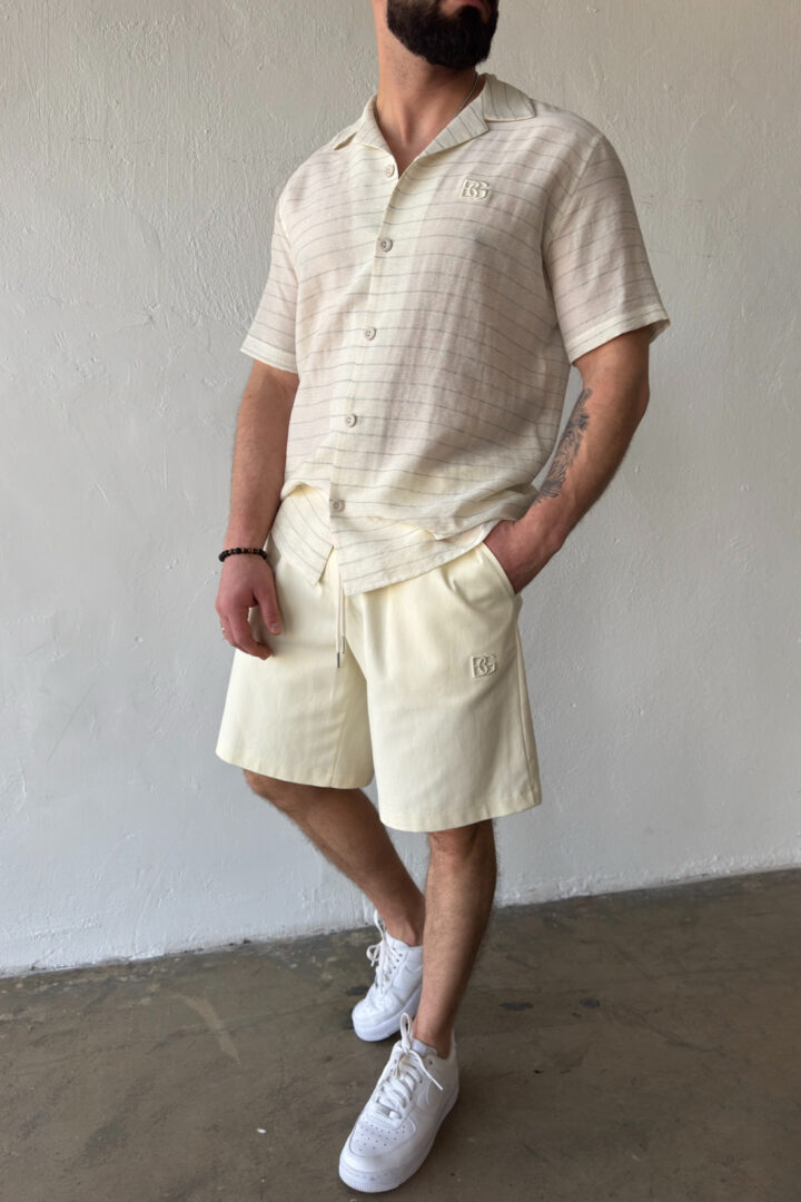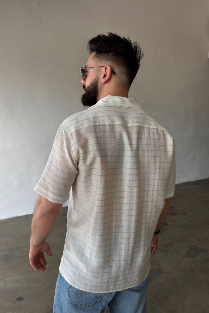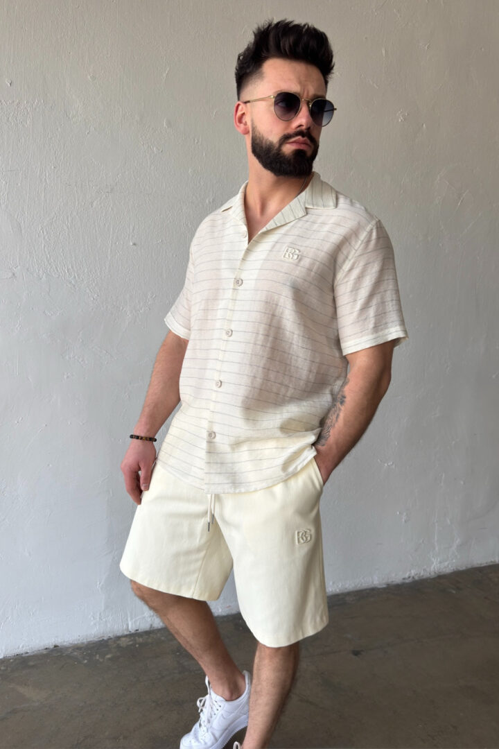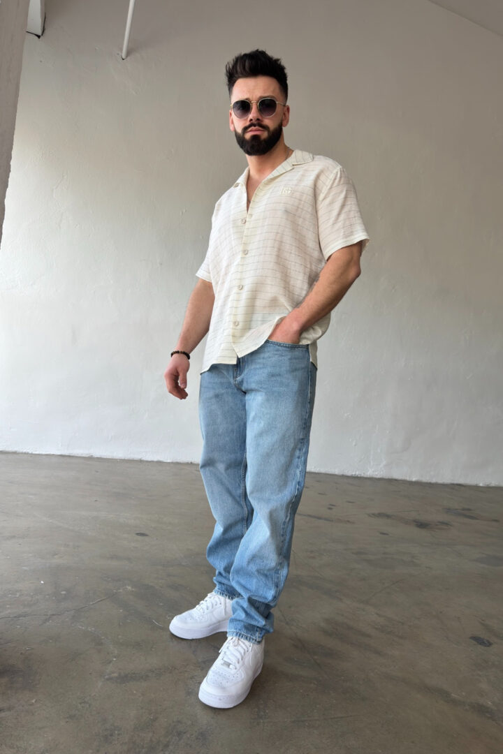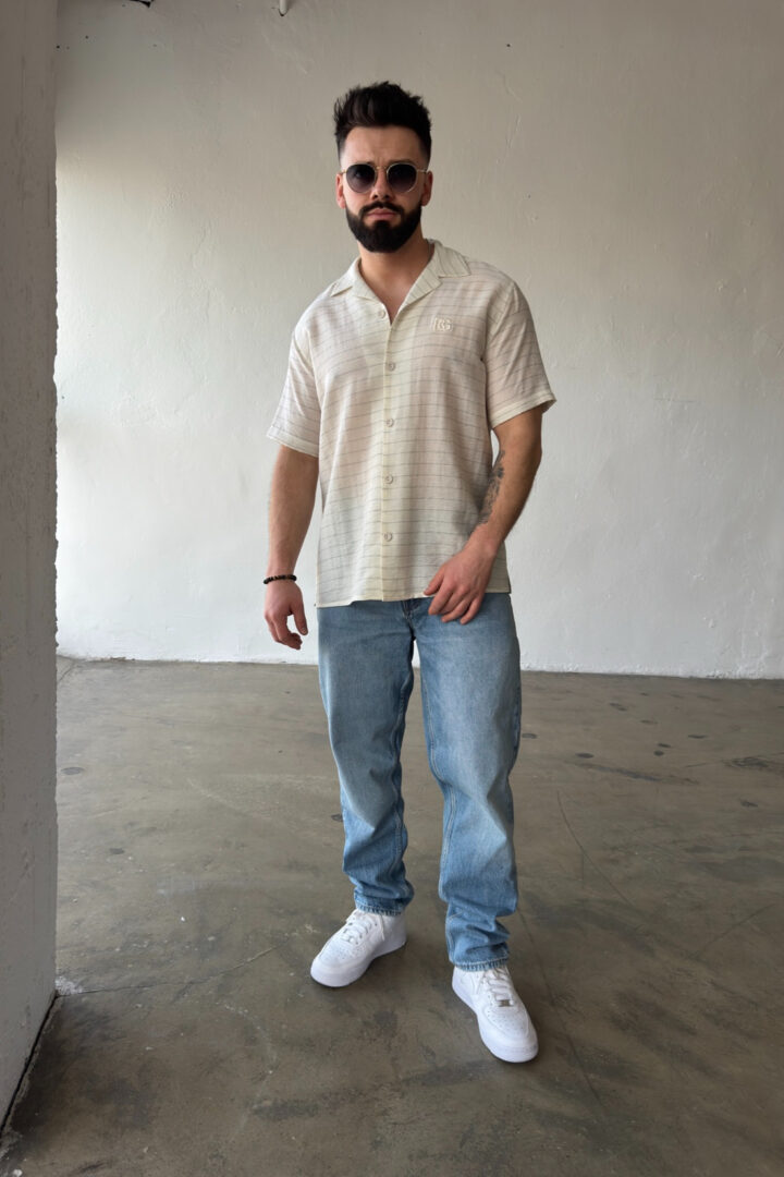 Opis produktu: Koszula męska BG MONSUN. Koszula wykonana z wysokiej jakości tkaniny wiskozowej z domieszką lnu. Koszula bardzo przewiewna o luźnym kroju z krótkim rękawem zapinana na guziki. Koszula ozdobiona haftowanym monogramem BG na sercu.