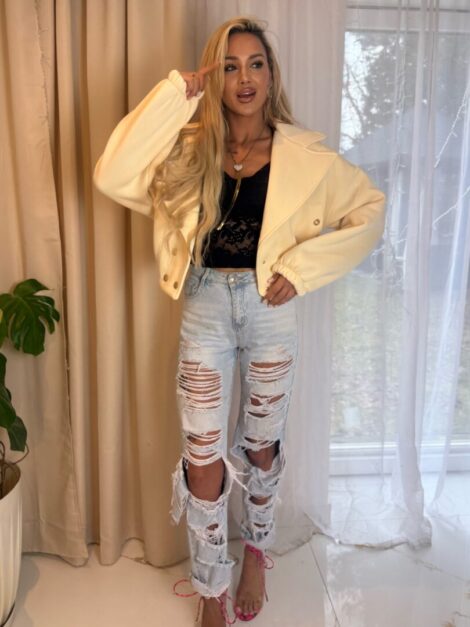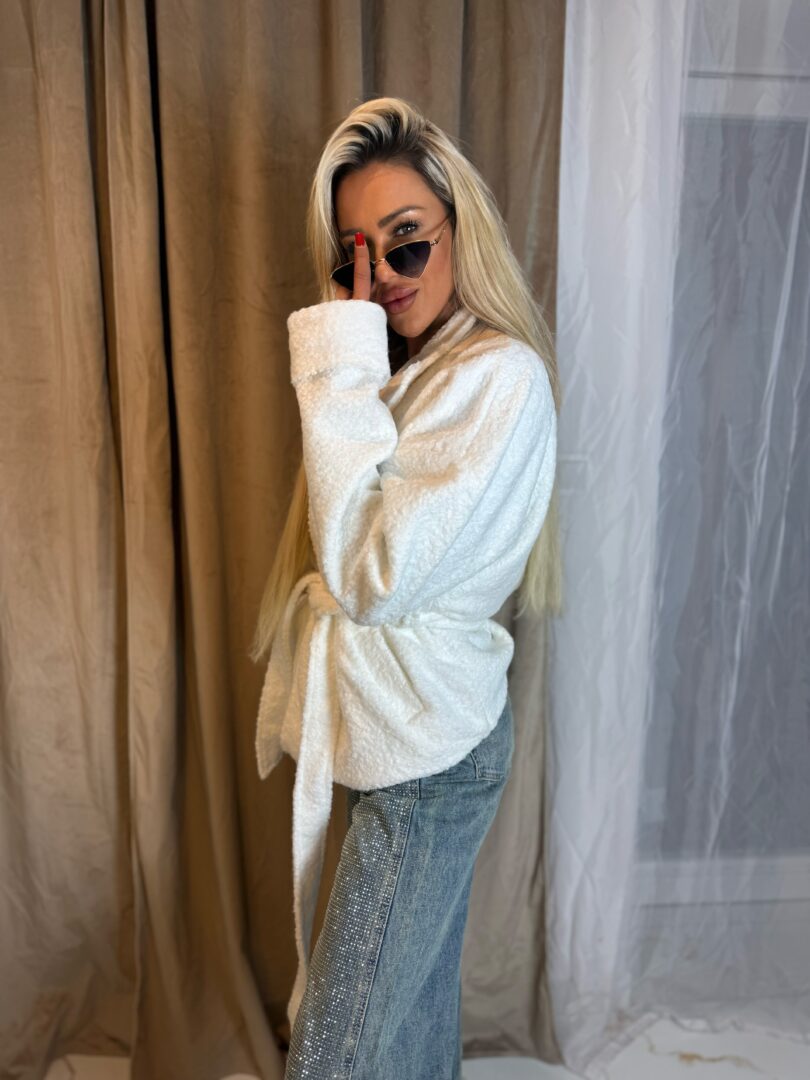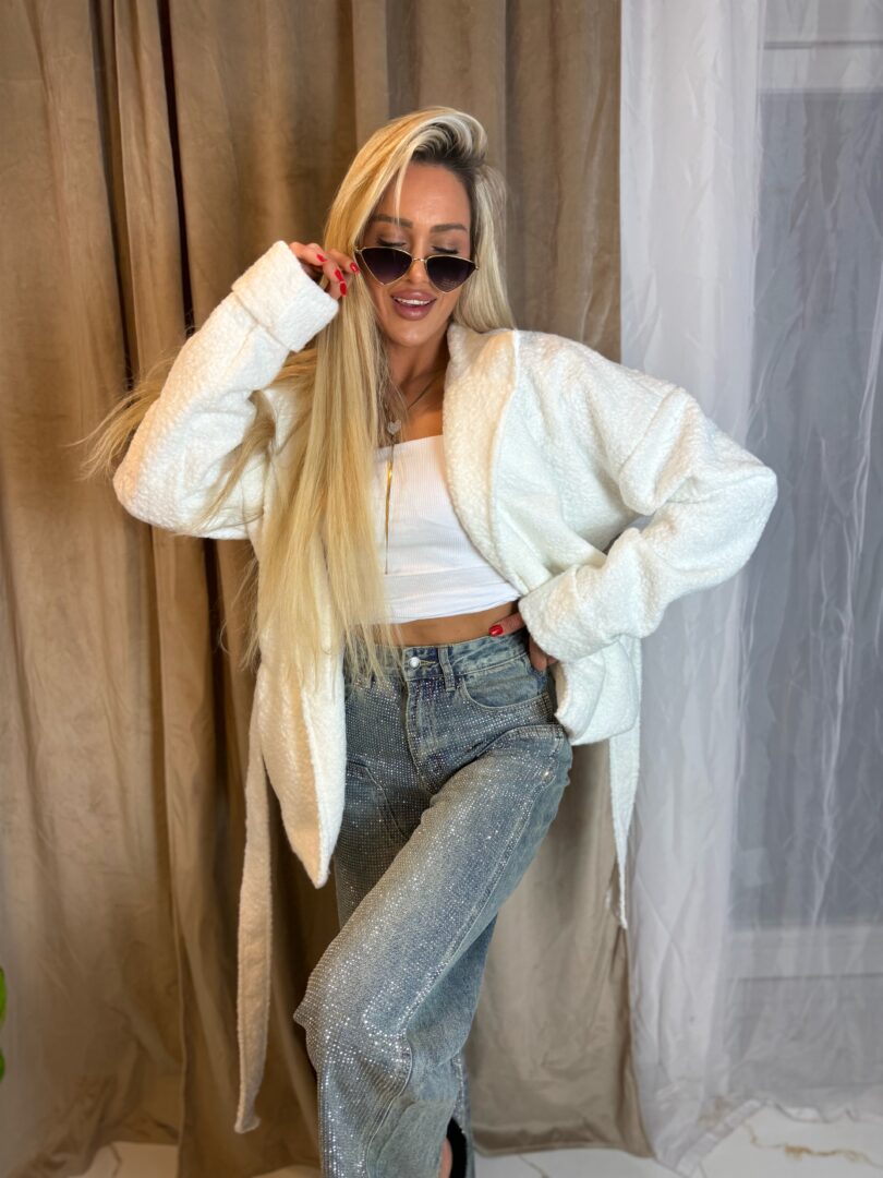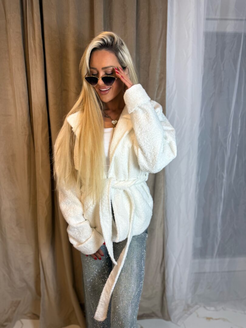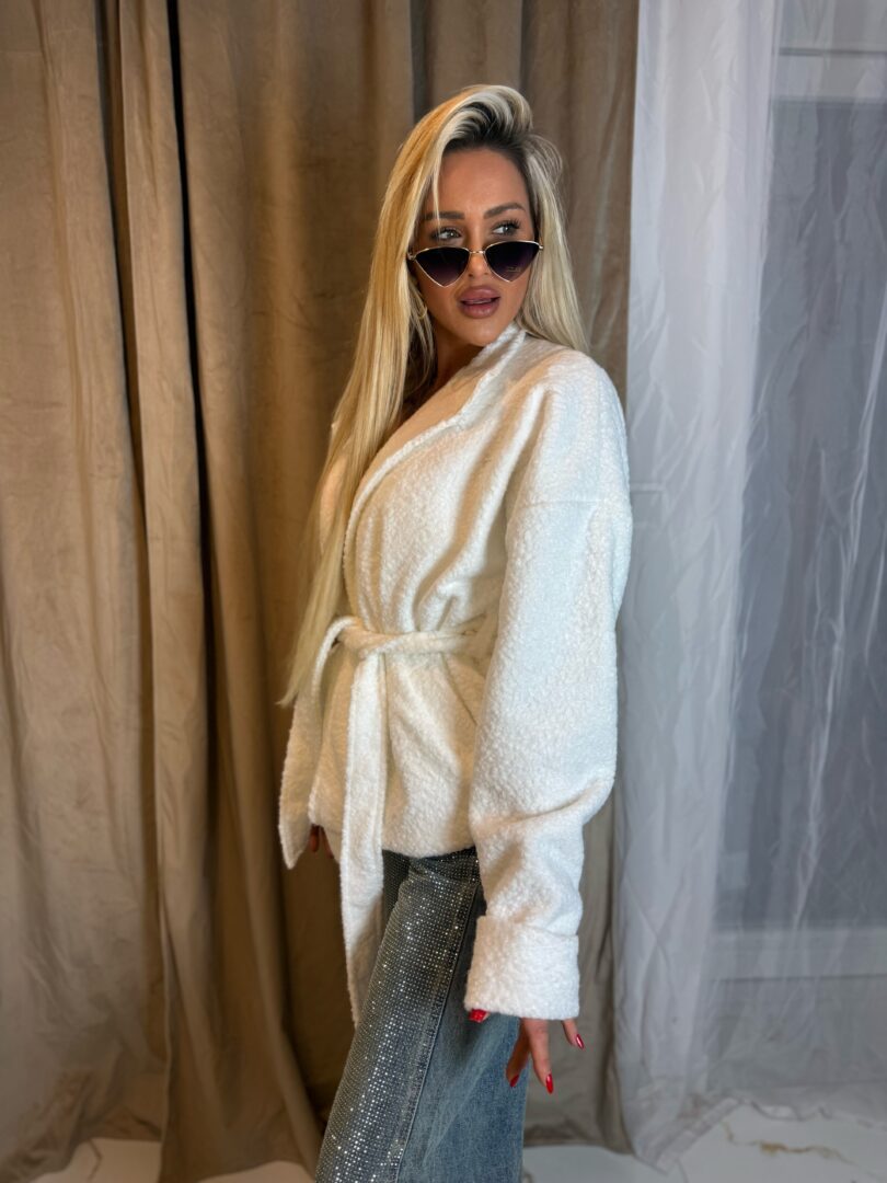 Model wykonany z miękkiego, przyjemnego w dotyku materiału o strukturze bukli, który nadaje całości eleganckiego i modowego charakteru. Kurtka posiada klasyczny kołnierz oraz wiązanie w talii, dzięki czemu pięknie podkreśla sylwetkę i daje możliwość dopasowania do figury.