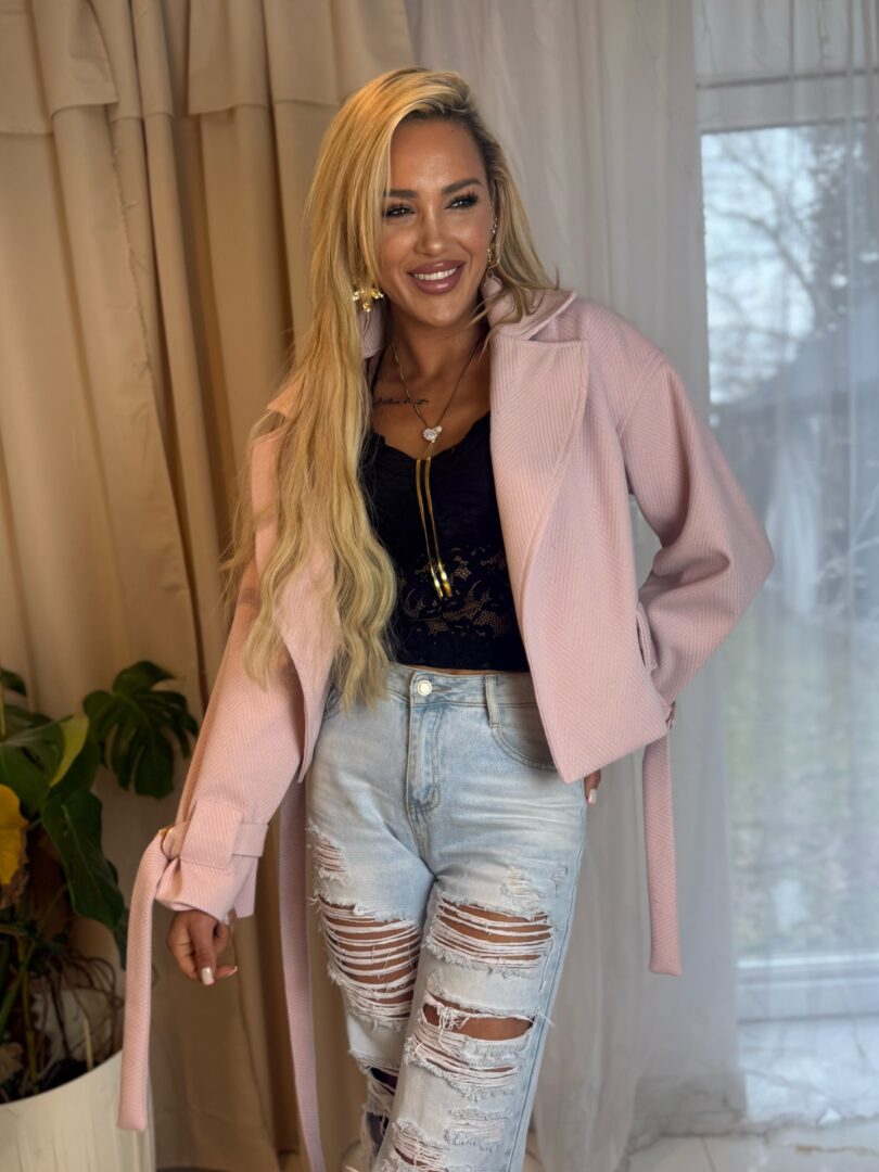 Stylowa krótka marynarka w modnych pastelowo-intensywnych kolorach to idealna propozycja dla kobiet, które chcą dodać swojej stylizacji charakteru i świeżości. Model posiada elegancki kołnierz, pasek do wiązania podkreślający talię oraz nowoczesny, lekko oversize’owy krój, który świetnie układa się na sylwetce. Wykonana z przyjemnego w dotyku materiału o delikatnej strukturze, zapewnia komfort noszenia i efekt premium.