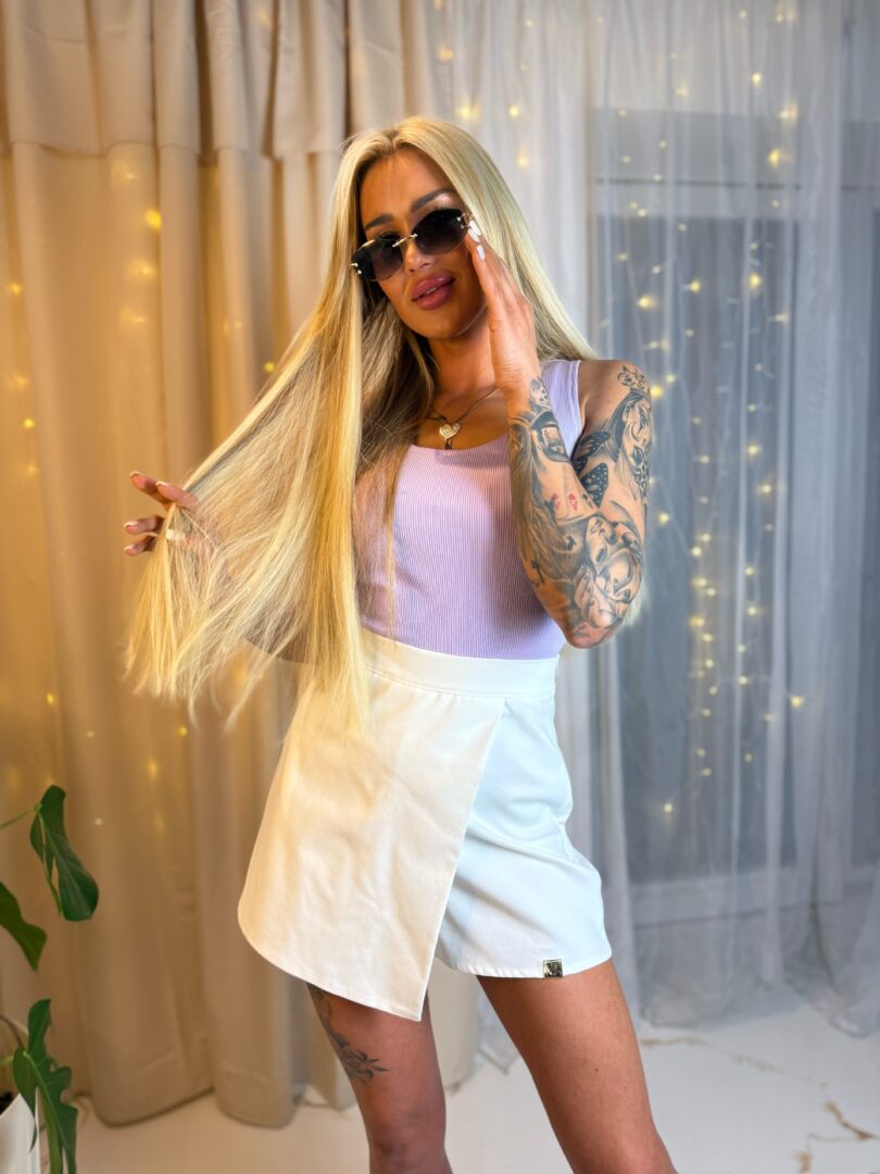 Stylowe spódniczko-spodenki o kobiecym, eleganckim charakterze. Model łączy w sobie wygląd klasycznej spódnicy z komfortem noszenia spodenek, zapewniając swobodę ruchów i wygodę przez cały dzień.
