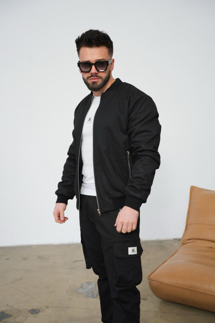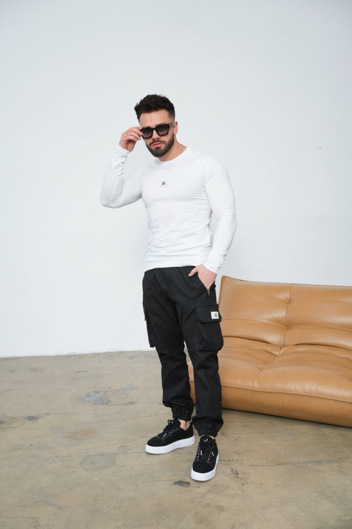 Opis produktu: Spodnie męskie BG DEAL z wysokiej jakości bawełnianego jeasnu. Spodnie posiadają gumkę w pasie oraz sznurek do wiązania od wewnętrznej strony. Duże kieszenie bojówkowe po bokach oraz na przodzie dwie kieszenie zapinane na suwaki. Na lewej patce kieszeni ozdobna naszywka z logo marki BG Brandenburg Couture. Mankiety zakończone gumką.