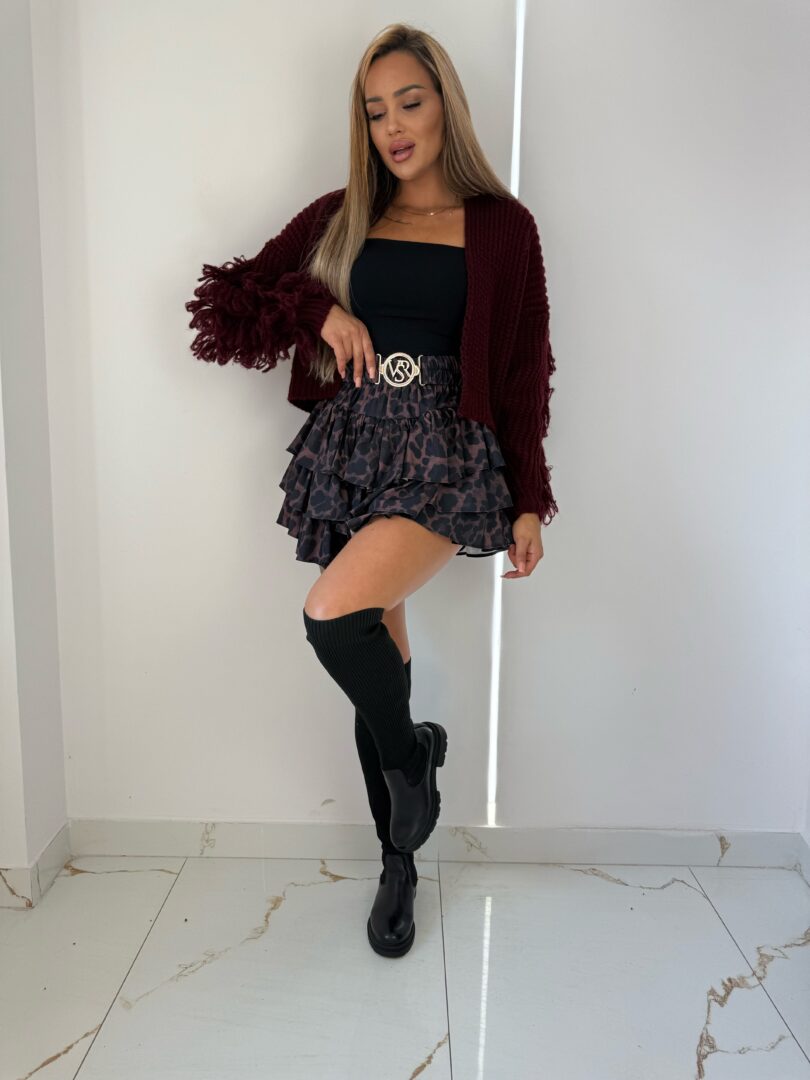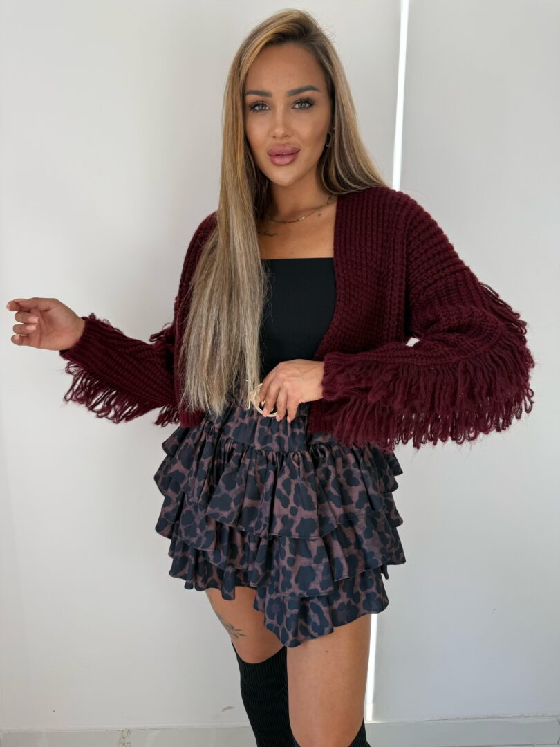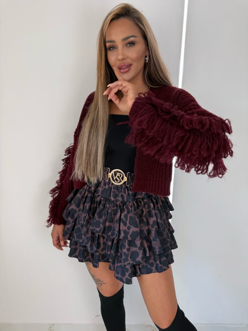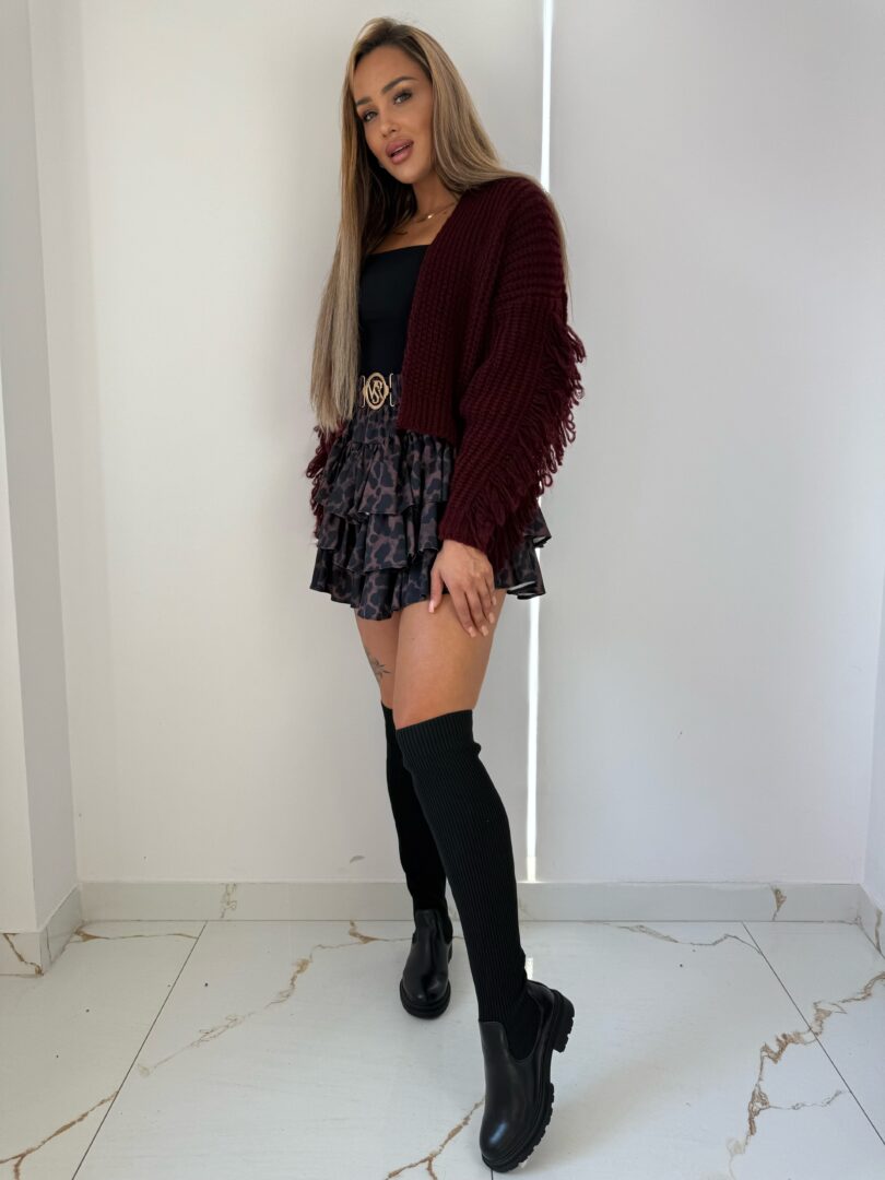 Stylowy, krótki sweter o luźnym splocie, który łączy modny design z wygodą. Model ma oversize’owy krój i szerokie rękawy zakończone efektownymi frędzlami, dodającymi mu charakteru i oryginalności. Miękka, przyjemna w dotyku przędza zapewnia komfort noszenia i otula ciepłem w chłodniejsze dni. Sweter ma głęboki dekolt w kształcie litery V, dzięki czemu świetnie komponuje się z topami i sukienkami. Idealny wybór do codziennych i wieczorowych stylizacji, który podkreśli Twój indywidualny styl.