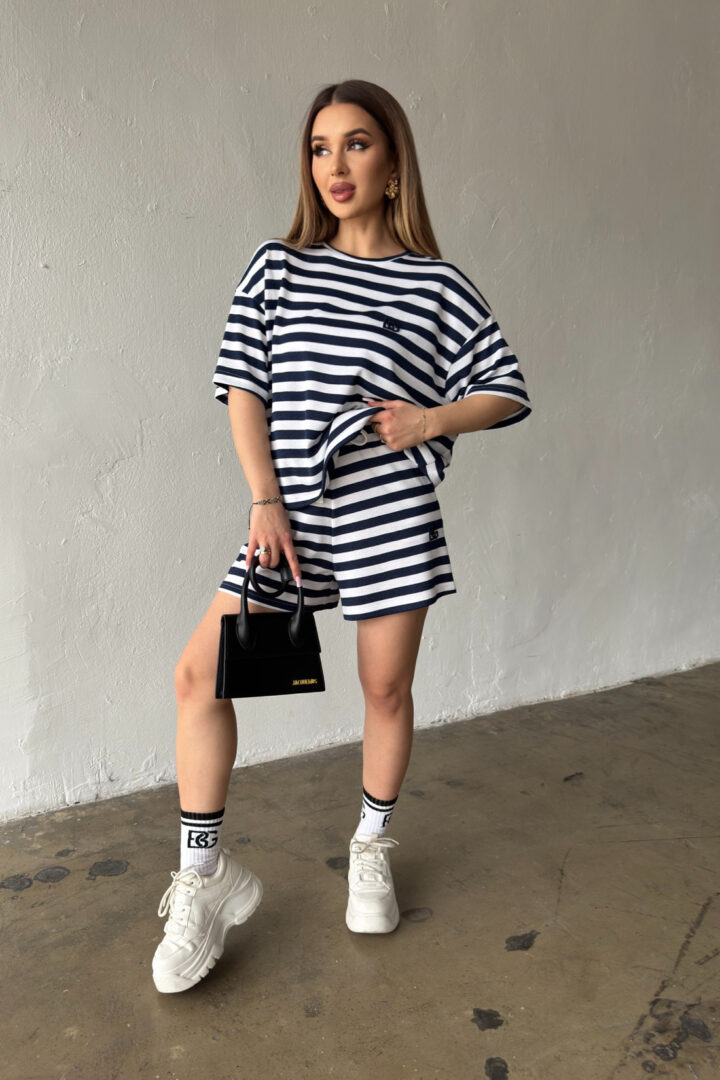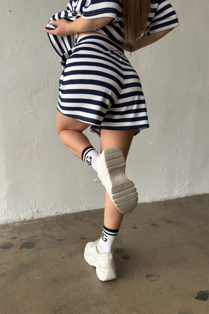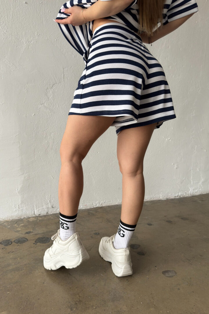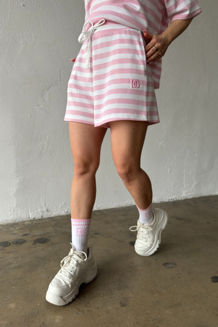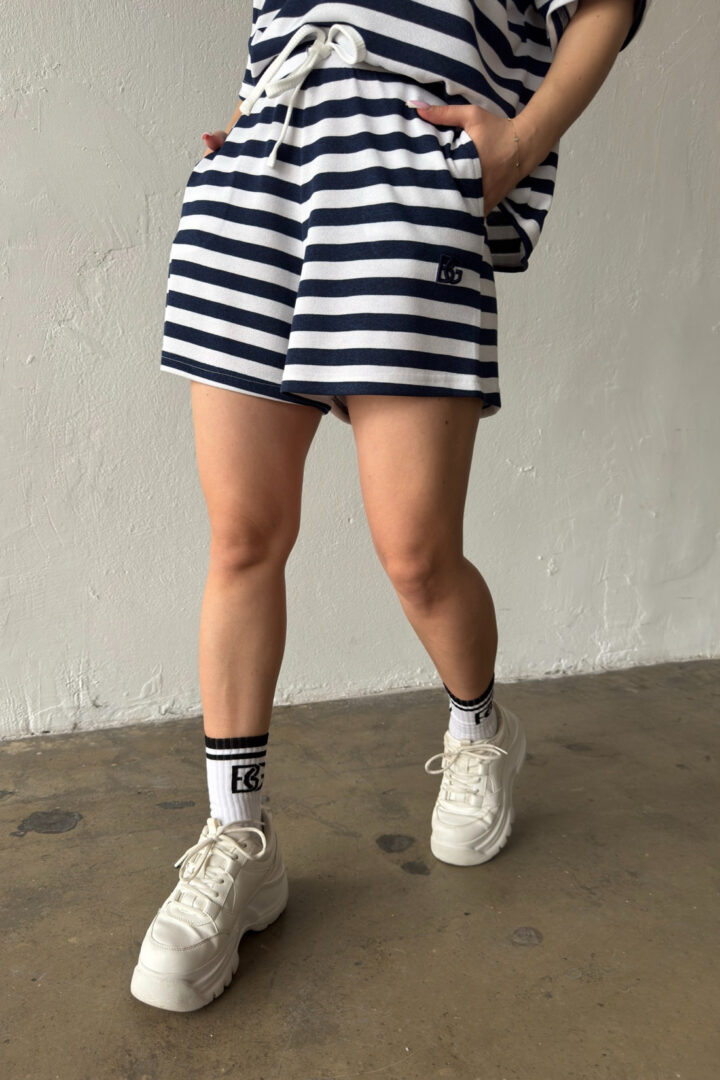 Szorty damskie BG JERRY z wysokiej jakości wiskozowej dzianiny sweterkowej. Spodenki o luźnym kroju. Na nogawce logowanie monogramem BG w tonacji pasków. Szorty z wysokim stanem, sznurek w pasie.