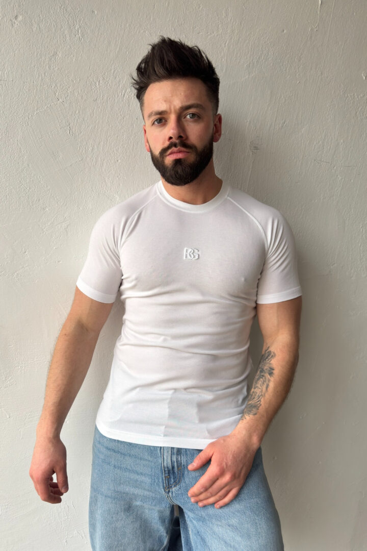Opis produktu: T-shirt męski BG LIGHT wykonany z wysokiej jakości wiskozowej dzianiny sweterkowej. T-shirt logowany monogramem marki BG na środku klatki w tonacji materiału. Dopasowany krój oraz reglanowy rękaw podkreślają sylwetkę.
